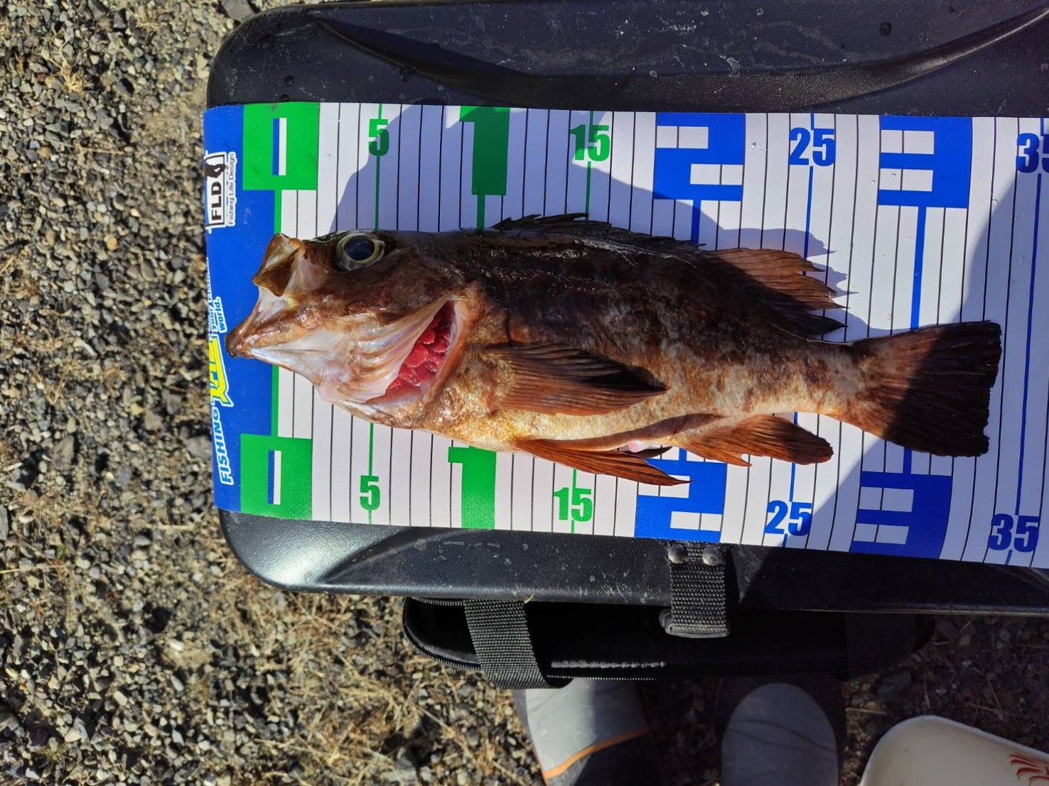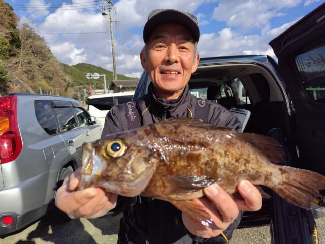 いつになく若い番号の5番クジで、「ボーグイ」に渡礁し、前年優勝者が釣った磯だと聞き、期待充分で釣り開始。ですが、北寄りの強風で釣り座が限られるのに加え、朝の内はエサも取られず、だんだん深く、遠くへとポイントを探っていきます。次第に日が高くなり、逆光でどこにウキがあって、どっちに流れているのか、何をやっているのかわからなくなってきたところで、磯際で日の光を避けたシモリ際へ投入すると、モゾモゾっとウキに違和感があり、これにアワセると、上がってきたのは30cm弱の良型カワハギ。続けて同じシモリ際を狙って、今度は先ほどのカワハギよりも重量感があった、33cmの大型メバル、うれしい他魚が続き、その次に気持ちよくウキが消し込んで、ゆっくり取り込んだのが、本命クチブトの38cmでした。これで一安心・・・が、その後33cmを一尾追加したのみで、長い時間が経過し納竿となりました。。。これでペースをつかめるほど、そんなに甘くありませんでした。また頑張ります!(^^)!