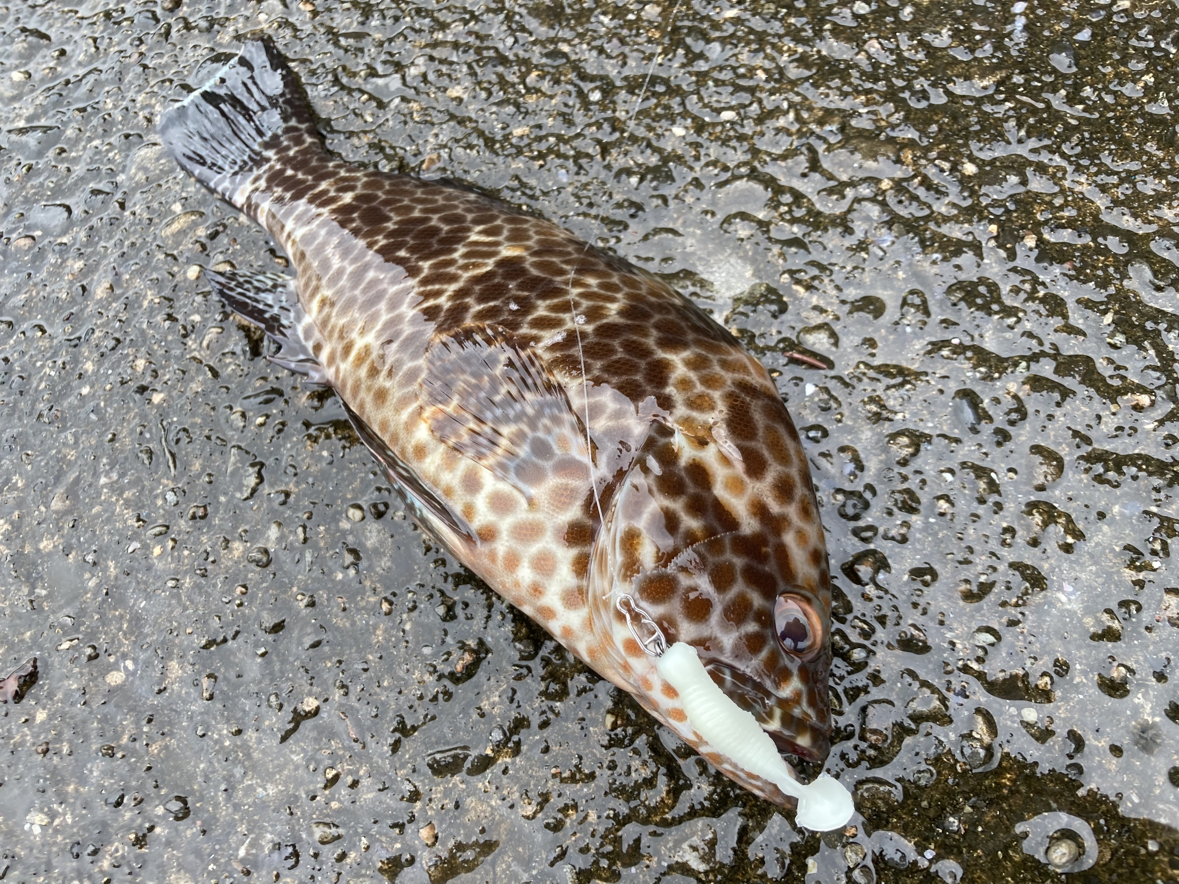 着底寸前にワームが消えたので、すかさずアワせると25cm程のオオモンハタ