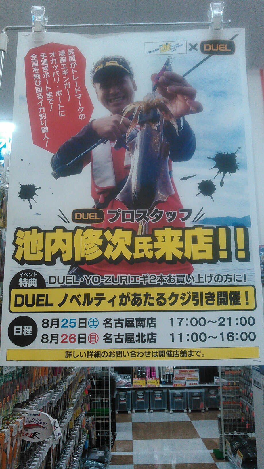 8月26日(日)、11時~16時までデュエルプロスタッフ池内修次氏が来店します!秋エギングやボートエギングについて、いろいろな事を聞けるチャンスです!当日はデュエル、ヨーズリのエギ2本お買い上げの方に!デュエルノベルティグッズがあたるくじ引きを開催いたします!