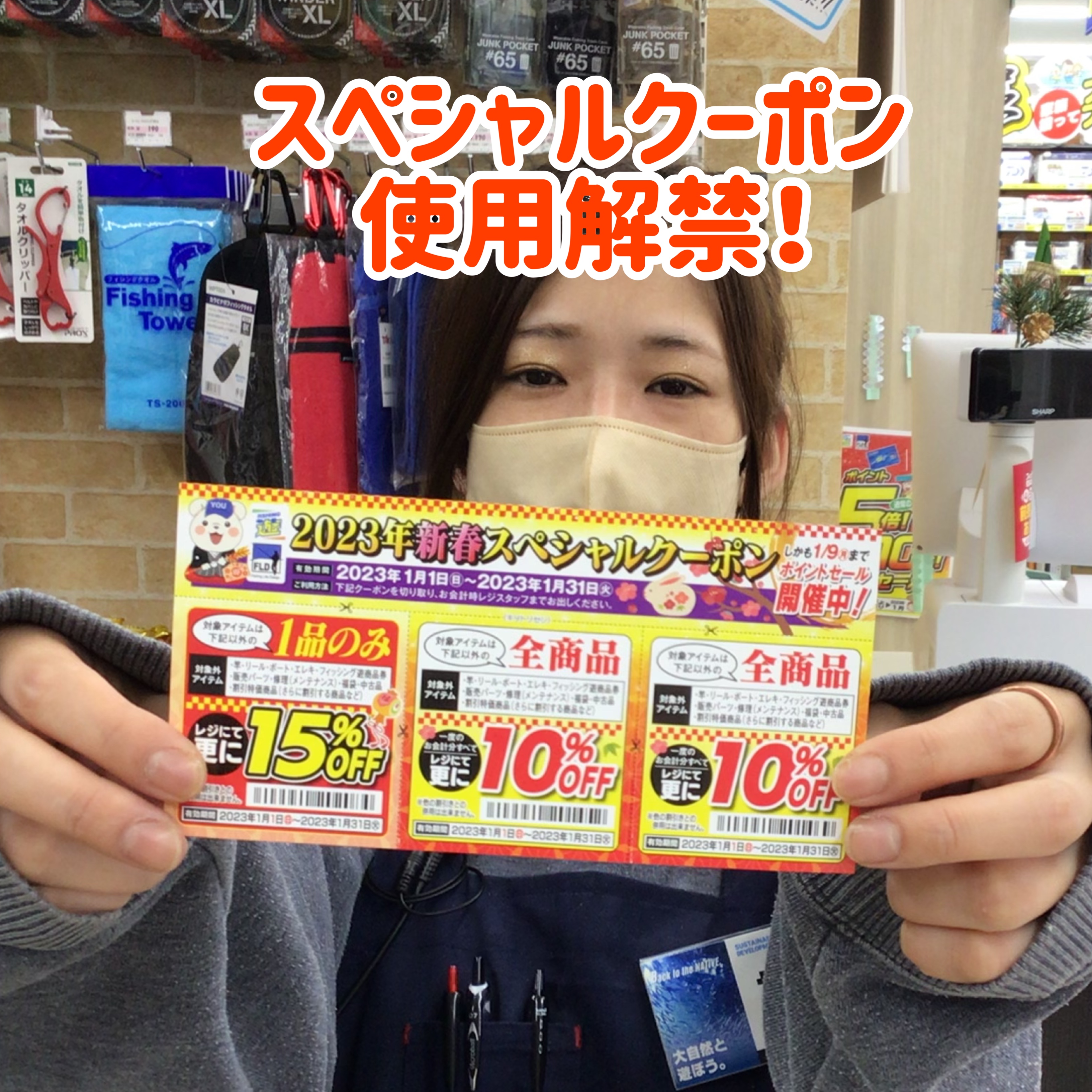 クーポンの使用期限は1月31日までです。また対象外商品も一部ありますので、ご不明な点はスタッフまでお尋ねください。