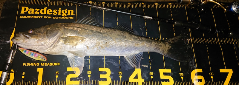 4月24日当店スタッフ仕事終わりに名港にシーバス調査に行ってきました、雨後で強風でした、シマノのサルベージソリッド100でシーバス1本釣る事が出来ました。