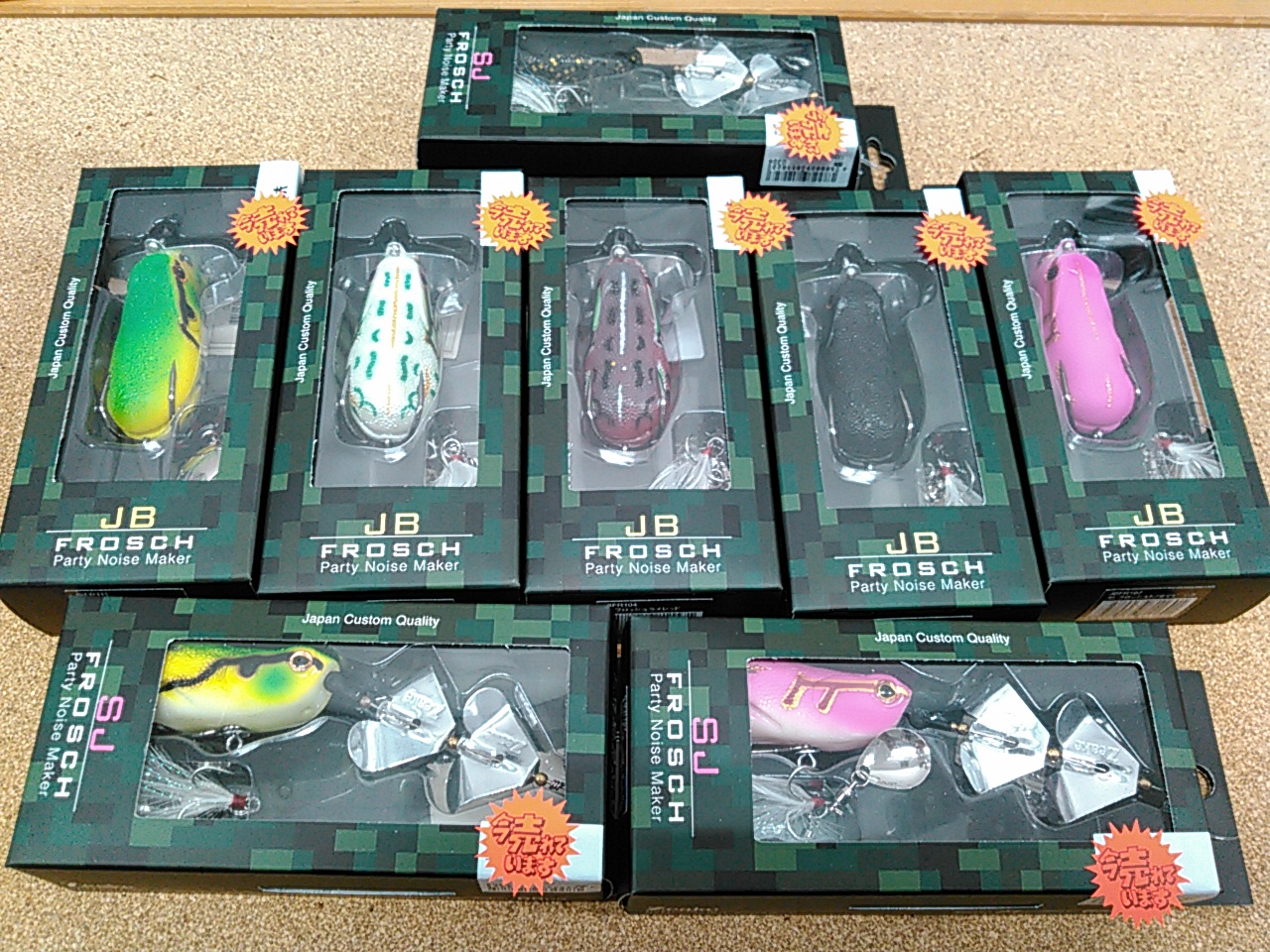 2019.06.04フィッシング遊中村黄金店 ジークの雷魚やナマズを狙えるカスタムフロッグ フロッシュの人気のjbとsjが入荷しました。ソフトな着水音でナチュラルで、ナマズは喰う前に微弱電気を帯びたヒゲで瞬間的に触ってから喰う様で樹脂製のプラグより圧倒的にスレにくく、喰いやすい様です。