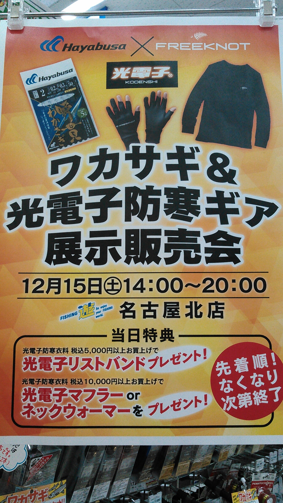 ハヤブサさんのワカサギ&光電子防寒ギア展示販売会が明日12月15日(土)に開催いたします!