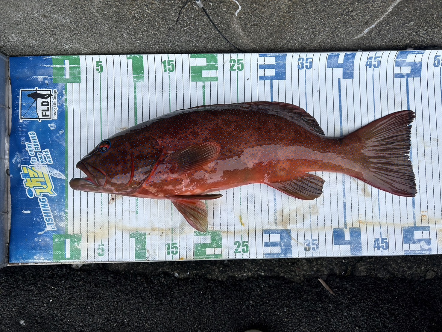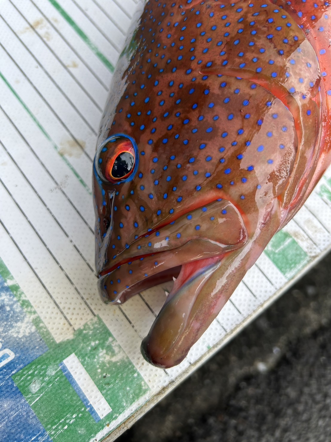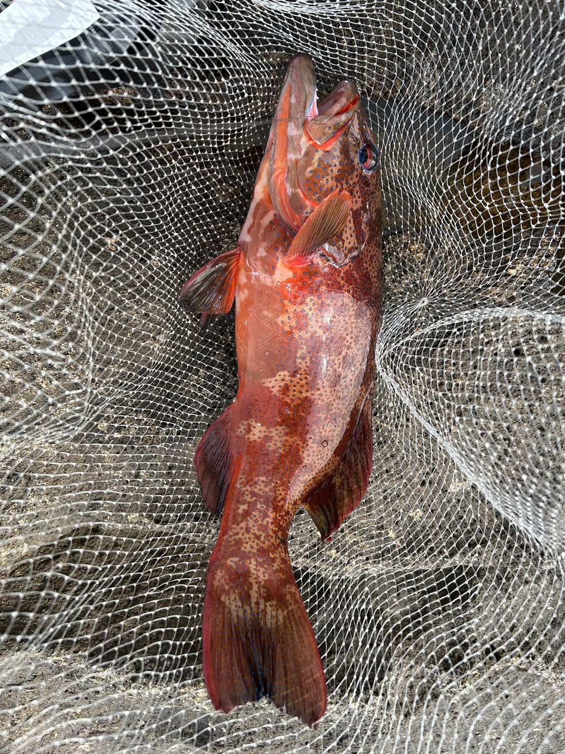 竿を立ててもすぐに浮いてこないので大物と確信して思いっきり竿を曲げてファイトすると浮いてきたのは赤くて大きい魚。「大きいアカハタかな?」と思いながらタモ入れするとなんだか違う!