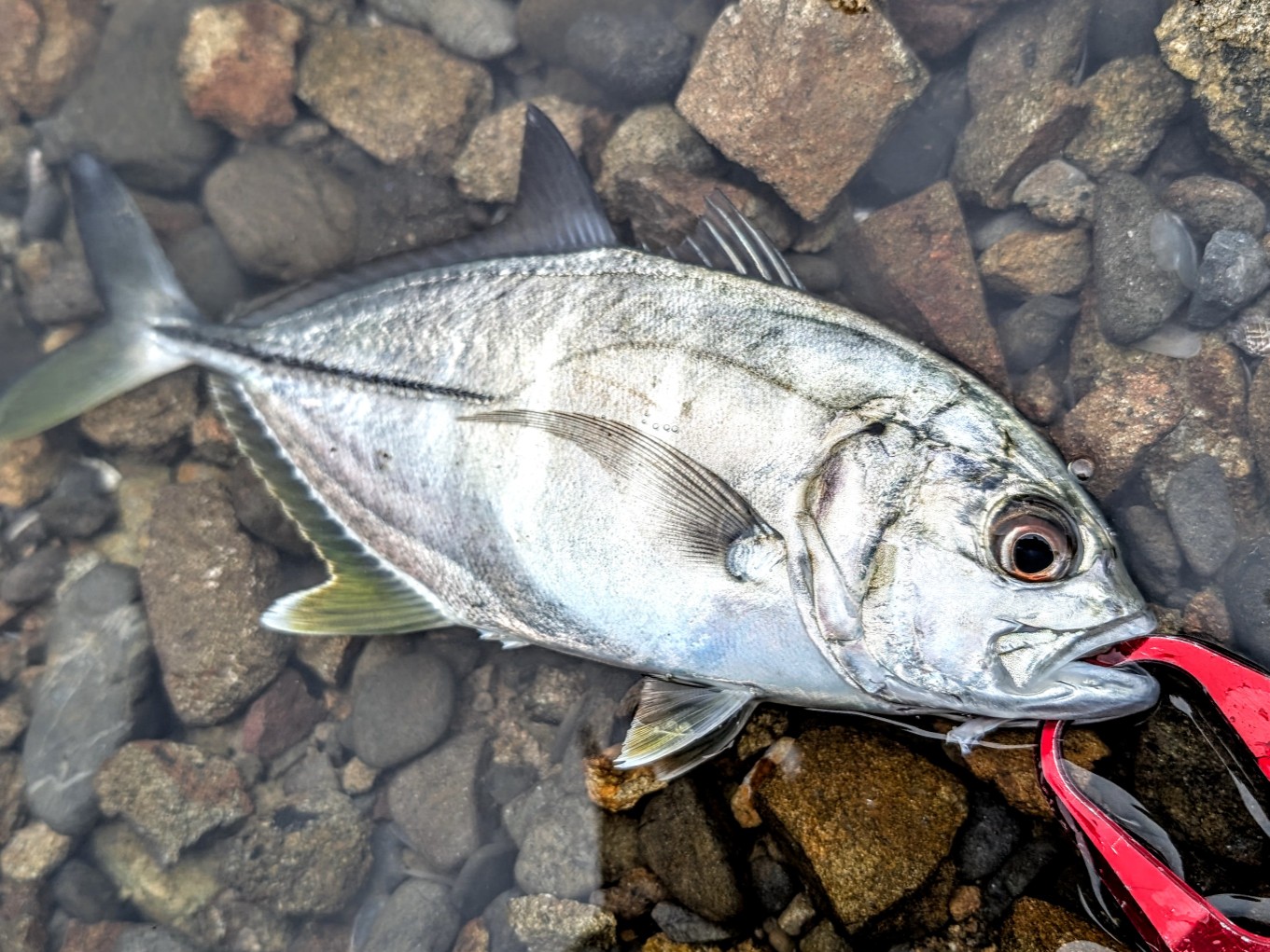 現場に到着すると、水面は静かで時折風が水面をざわつかせています。早速キャスト!トゥイッチしながらのファーストリトリーブ!反応無し!やはり…、風が収まり水面が鏡のようになってきたので、もしや?とリトリーブスピードを若干スロー側にシフト…、『 バコーーーーン!! 』派手な水面爆発でナイスファイトのギンガメアジ25㎝クラス♪