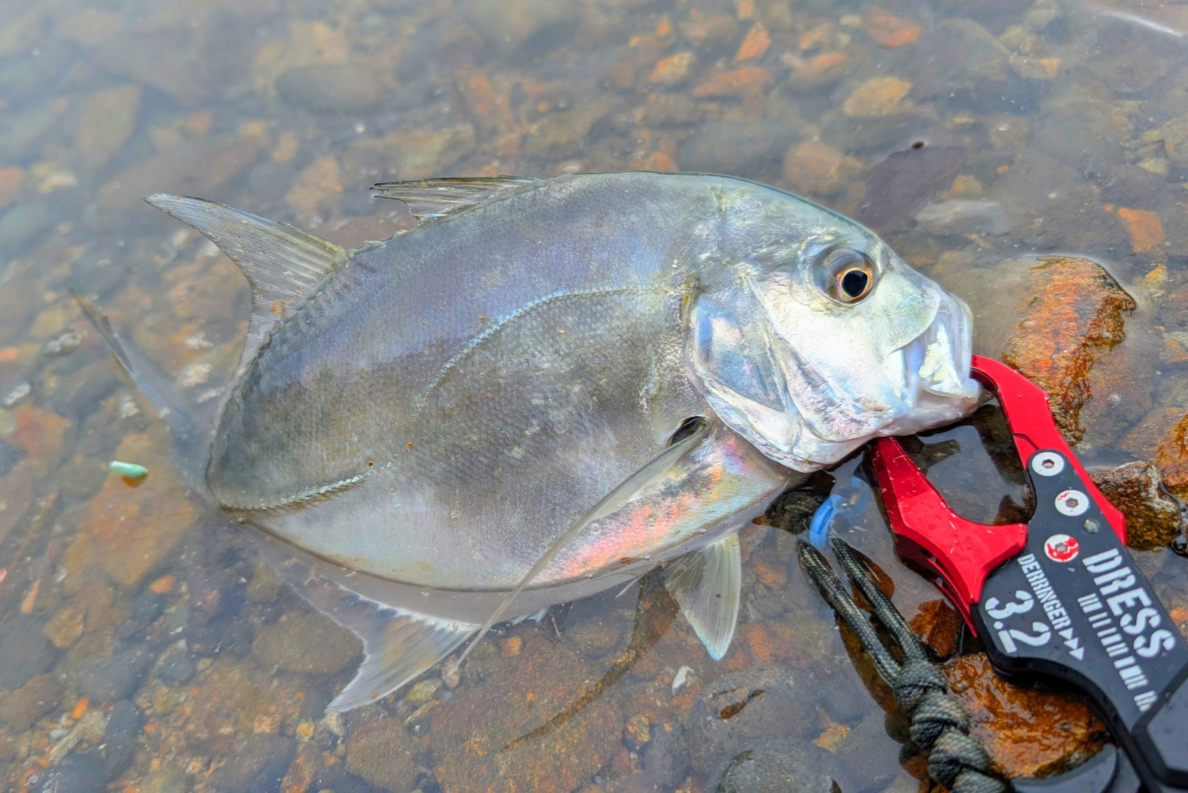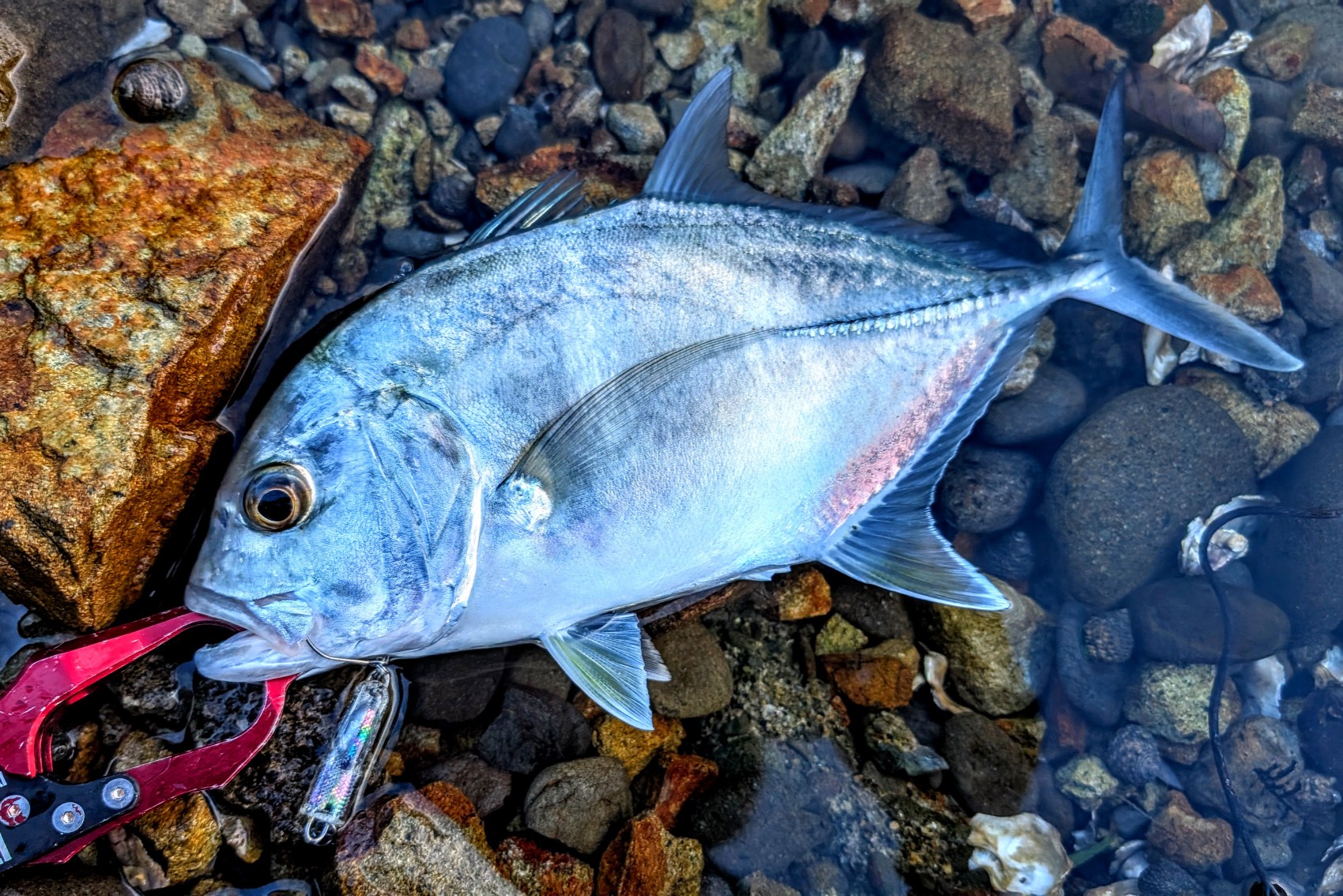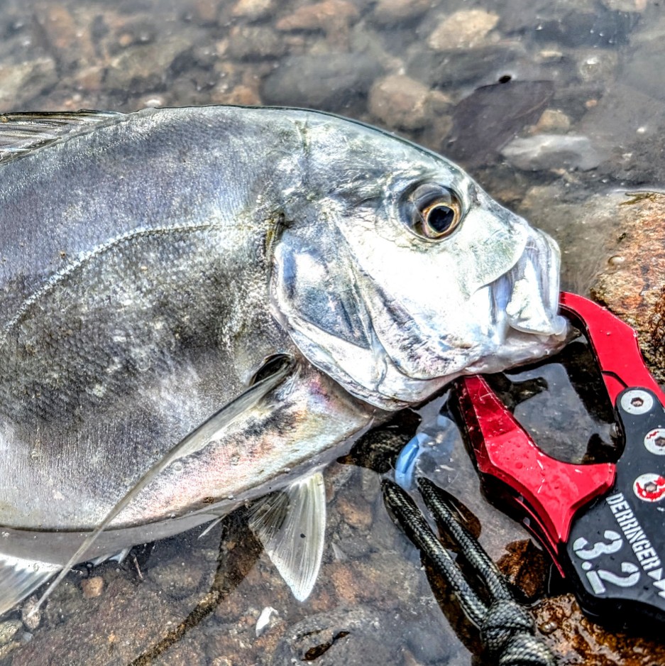 キャスト!着水!リトリーブ開始!連続トゥイッチ!カケアガリの手前でダイブを多めに入れてからのポッピング!『 バチーーーン!! 』とルアーを真横からバットで叩かれたような衝撃でロッドをひったくられました!『 デカい! 』ドラグがいつもより長く鳴き続けロッドがバットからひん曲がります!年無しサイズのチヌ以上のパワーでファイトします。尺メッキ?!なんとか足元まで寄せて抜き上げようとする重さに尺サイズ?と思いましたが28㎝を少し超えたロウニンアジでした。
