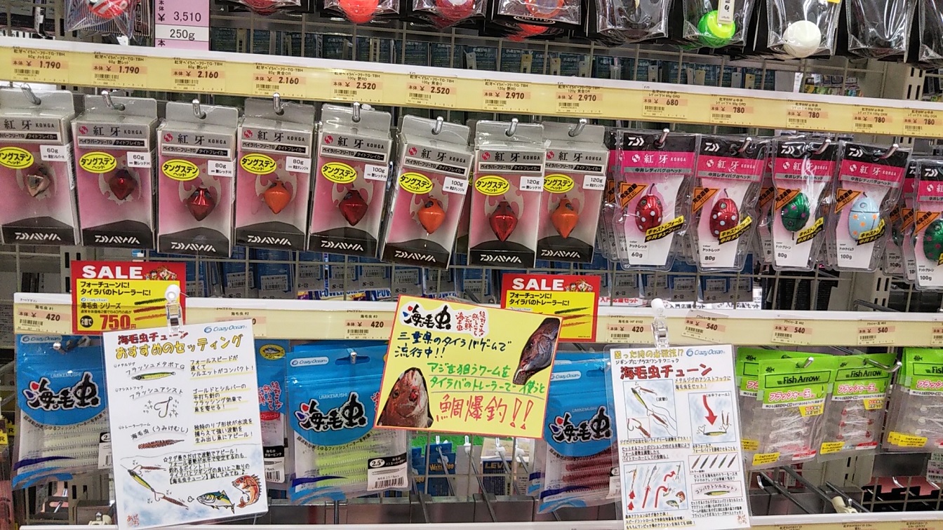 また、当店では只今「ビッグサマーセール」を開催中です!タイラバのトレーラーとしても使用出来る「海毛虫」シリーズが超お買得となっております。ぜひぜひ店頭で!!!