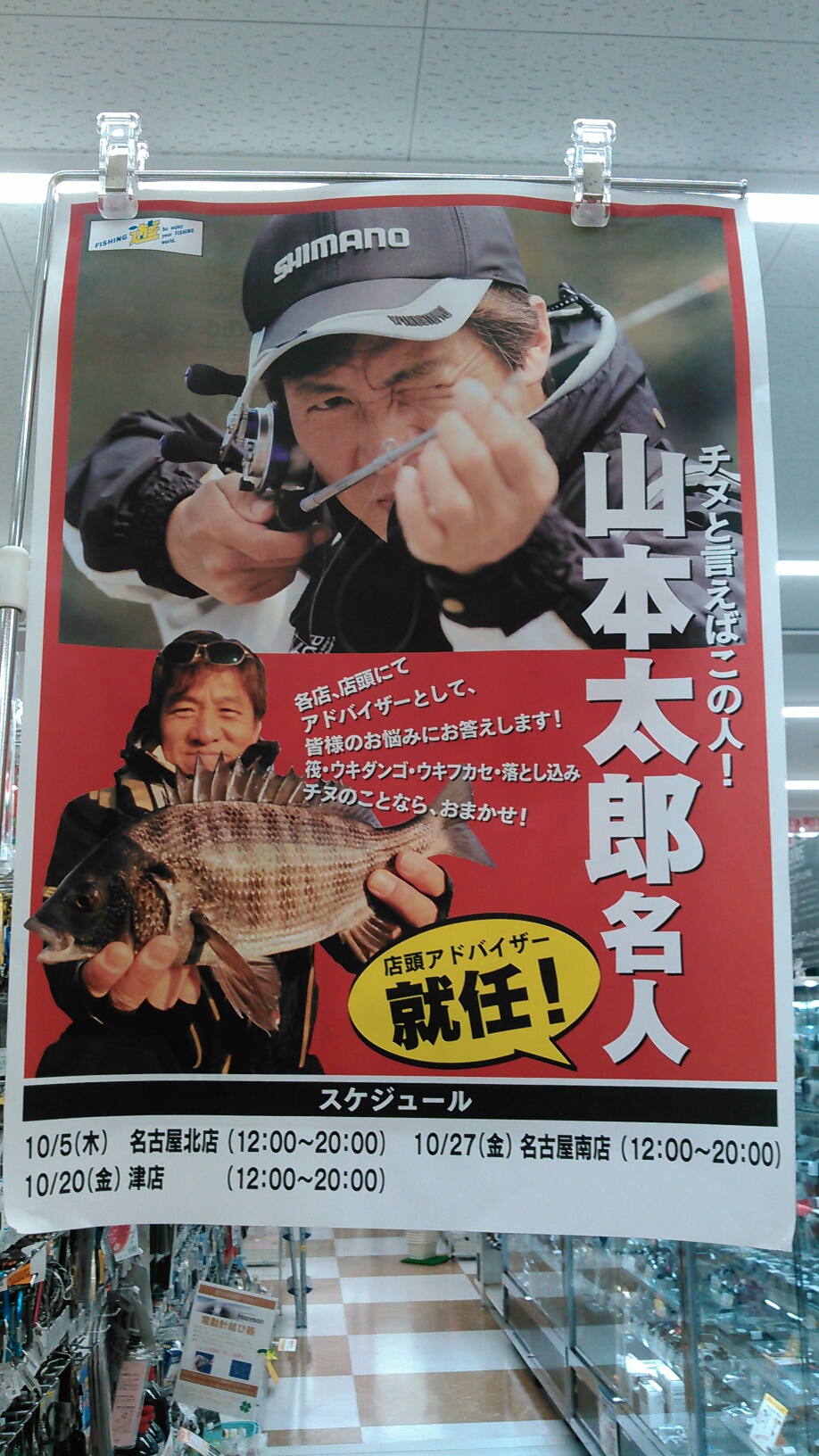 明日、10月5日木曜日午後12時~午後8時まで、チヌ釣り名人山本太郎氏が来店されます!チヌ釣りについて聞いてみたいことがある方は是非、ご来店ください!