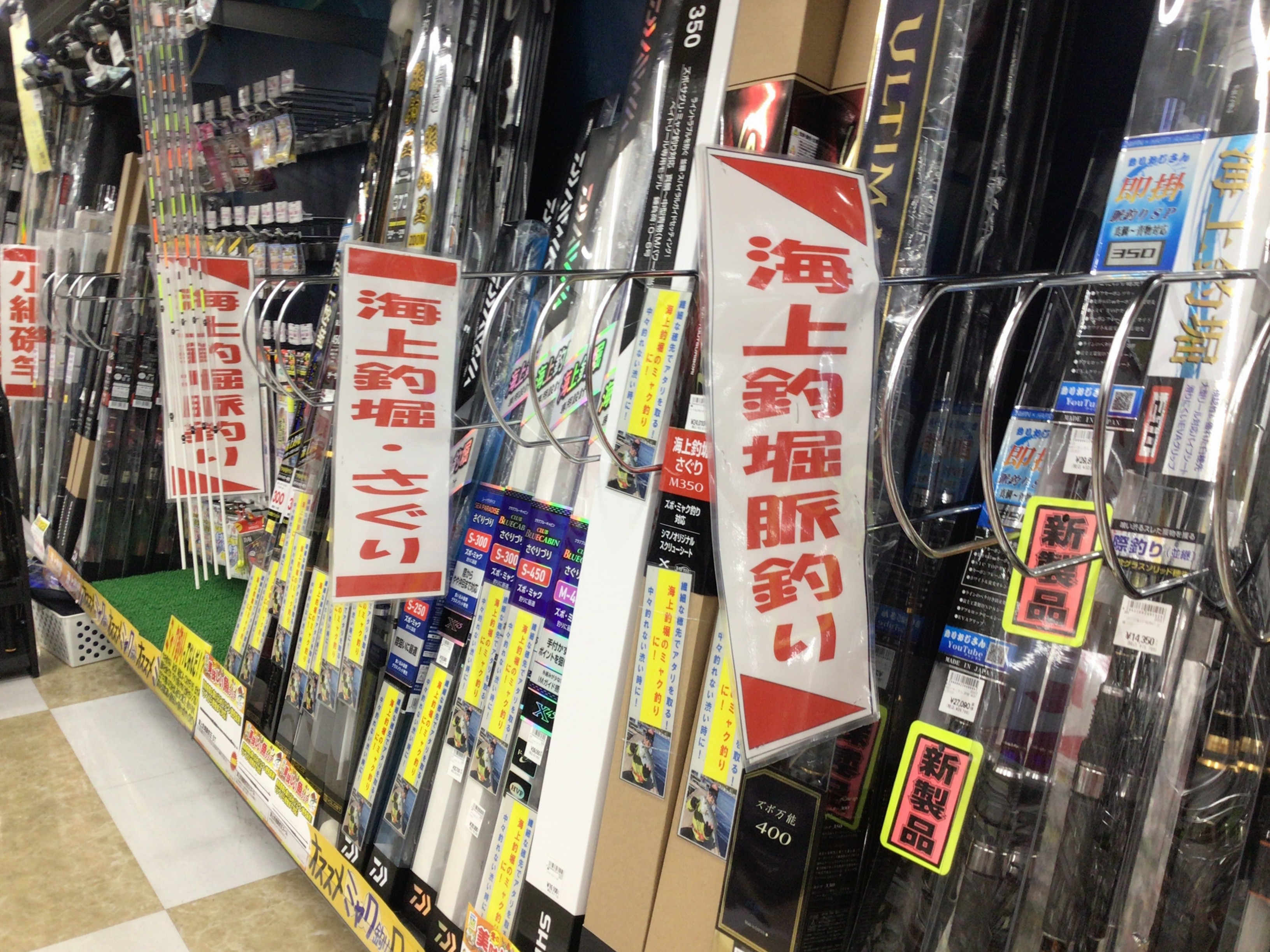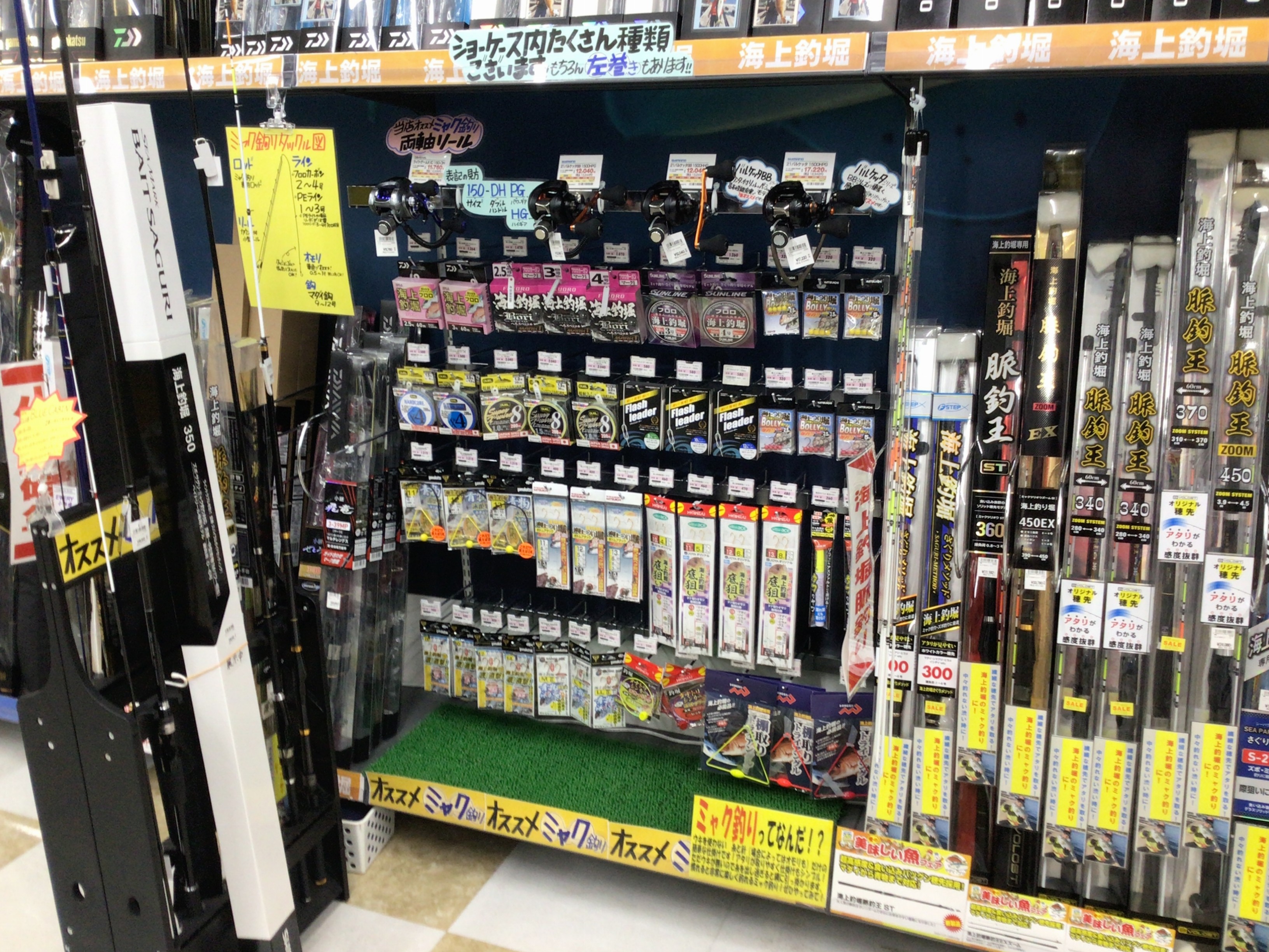 名古屋南店では店内奥の竿コーナーにて海上釣堀の脈釣り