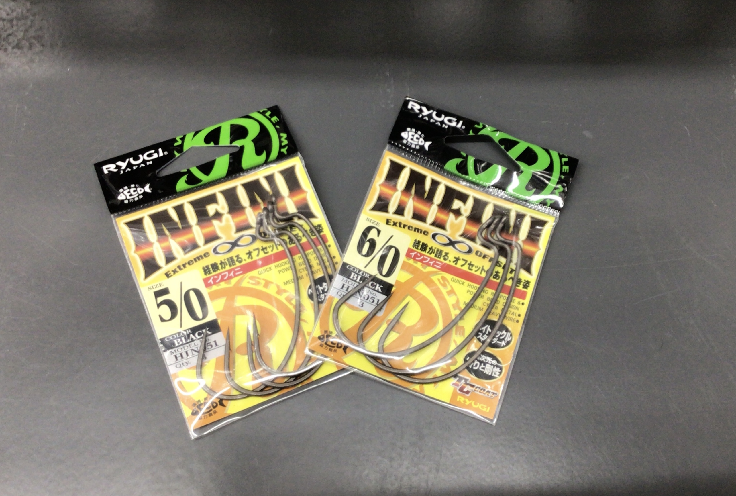 針は、RYUGI インフィニ 4.8は5/0 5.5は、6/0。色々試した結果、このフックが姿勢も安定します。またフックが上に向いて