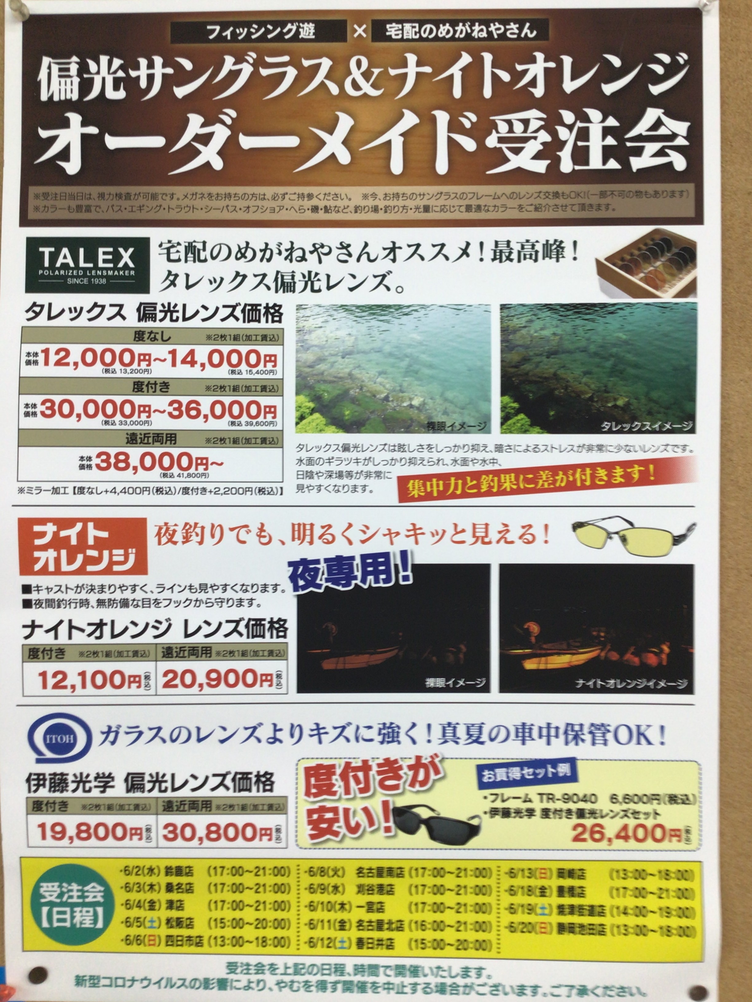 2021.05.16いつもありがとうございます。フィッシング遊鈴鹿店です。毎回大好評の宅配のメガネ屋さんの受注会が、来月の6月2日、17時から21時で開催されます。前から欲しかった