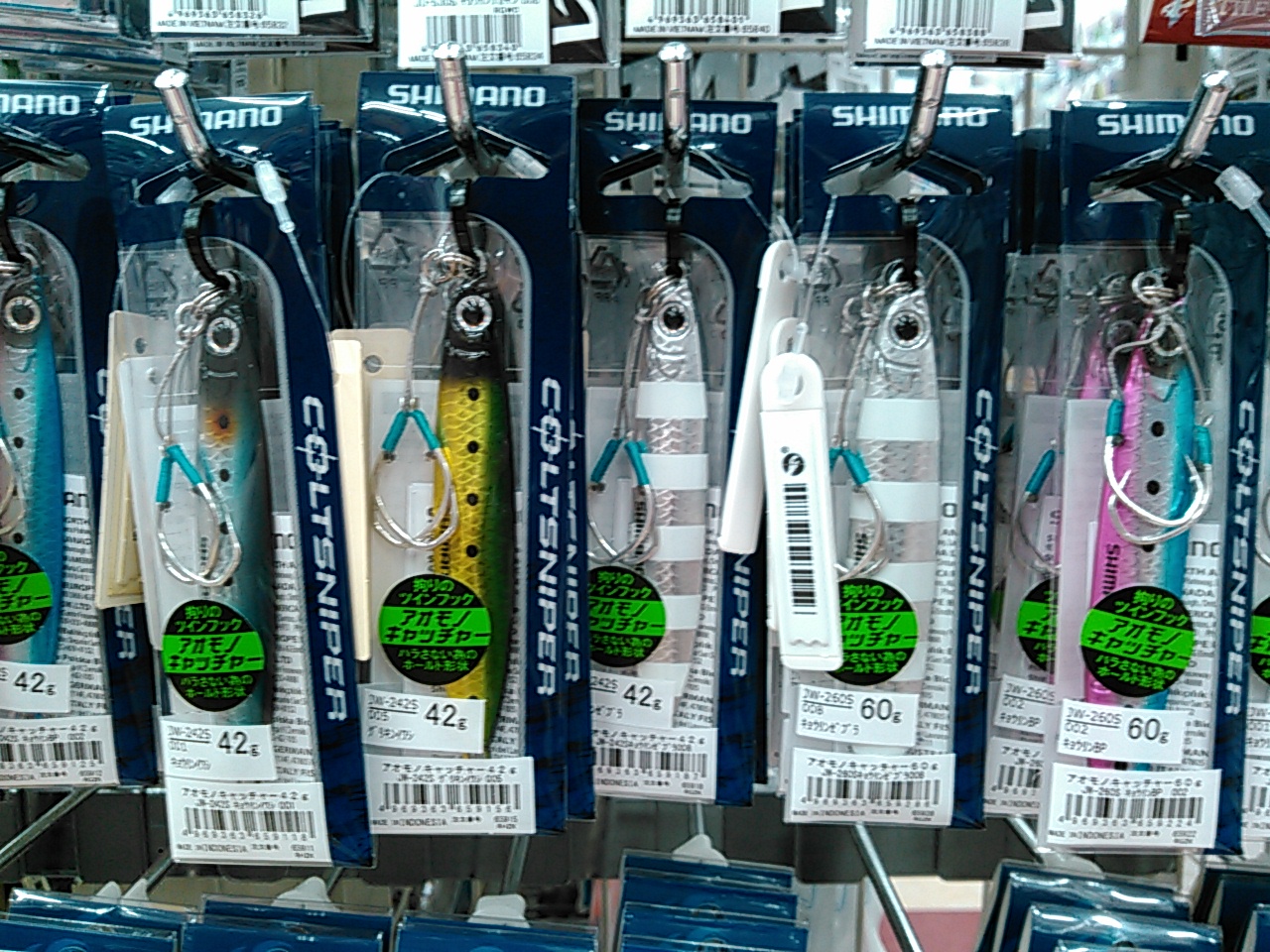 シマノの新製品キャスティングジグ アオモノキャッチャー入荷しました、シマノの実績のある人気ジグコルトスナイパーにバラシにくさを一番に考えた、専用フックをセッティングしたモデルです。