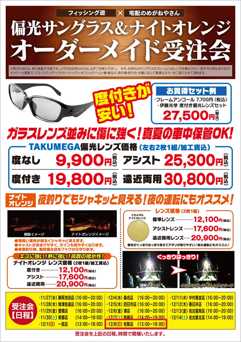 高性能偏光レンズを使用した偏光サングラスの作成や夜用のナイトオレンジの作成など、好みのフレームに合わせてオーダーできちゃいます!