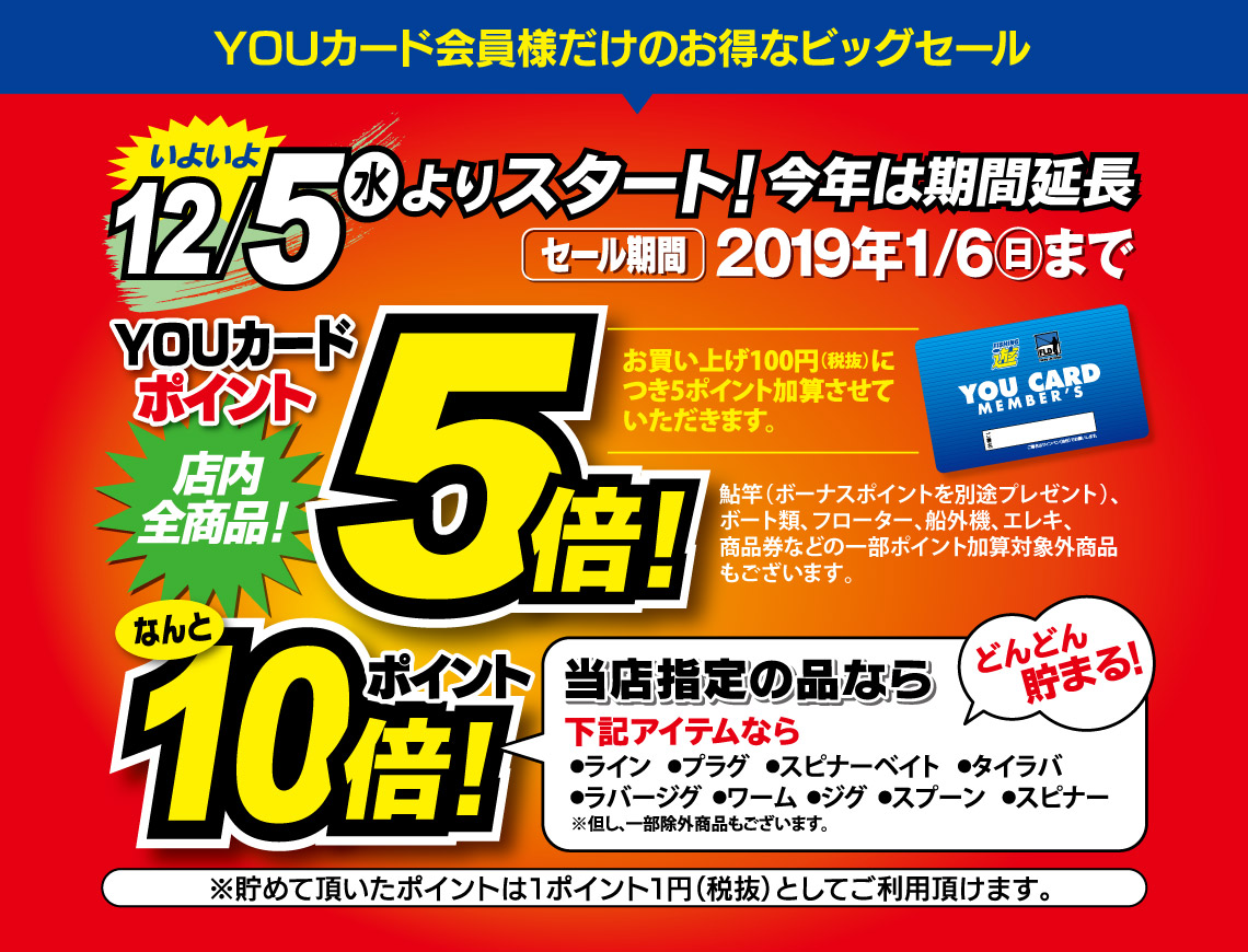愛知県・静岡県内のフィッシング遊・FLD店舗対象!毎月2と5のつく日(2日・12日・22日・5日・15日・25日)は、ポイントが2倍になります!