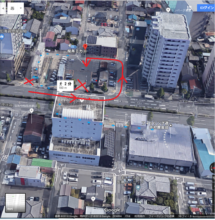 向かい側のピンが臨時駐車場になります。×印からは駐車場に入れませんのでご了承ください