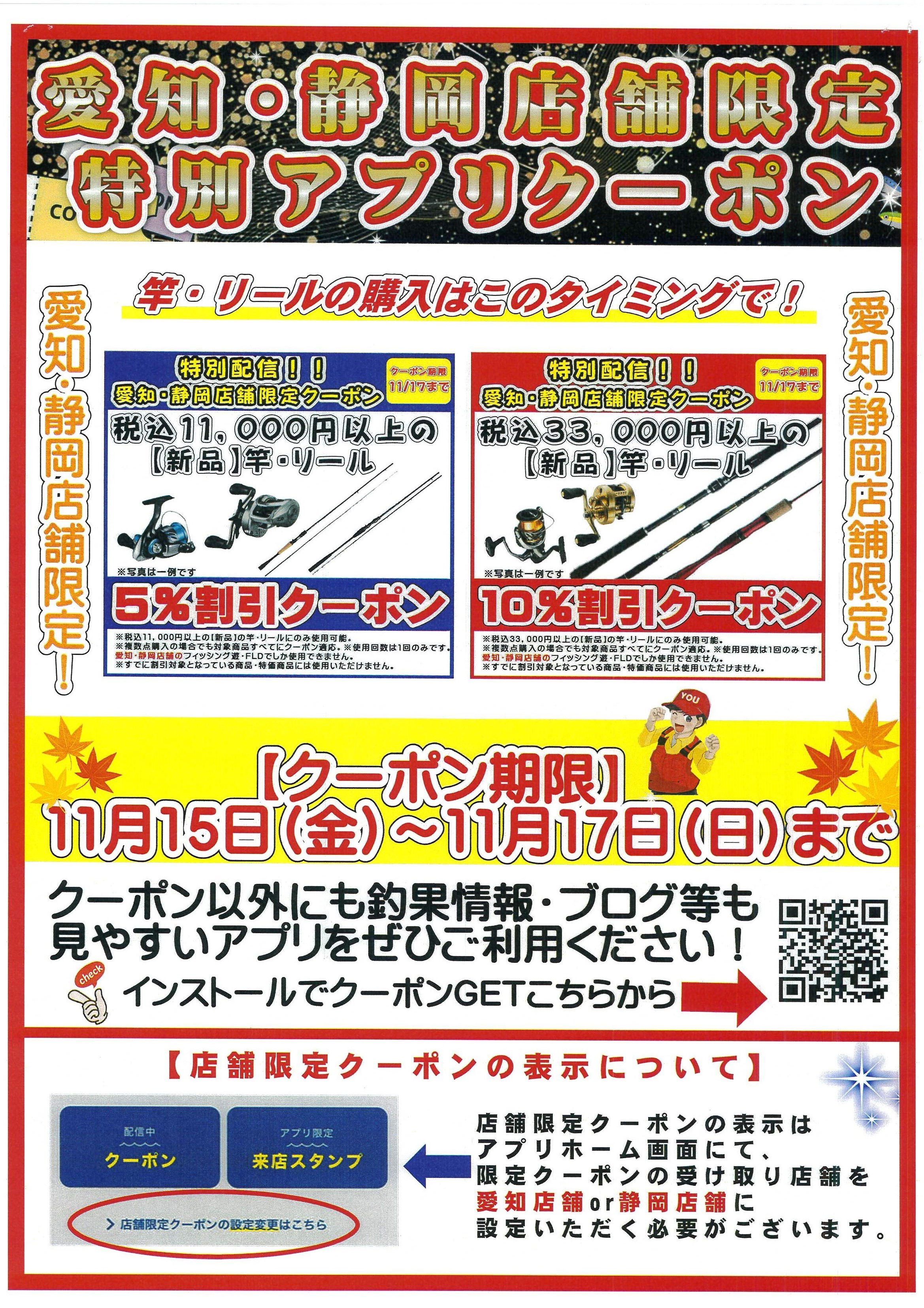 2024.11.15フィッシング遊豊橋店です!本日から配信中のとってもお得なアプリクーポンのご案内です!