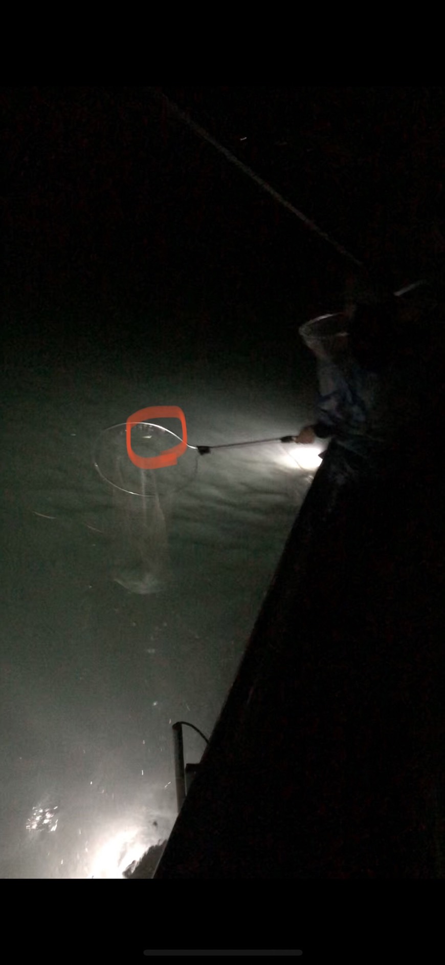 写真のように橋の下にロープをくくりつけた状態でライトで水面を照らし流れて来る車エビを待ちます!