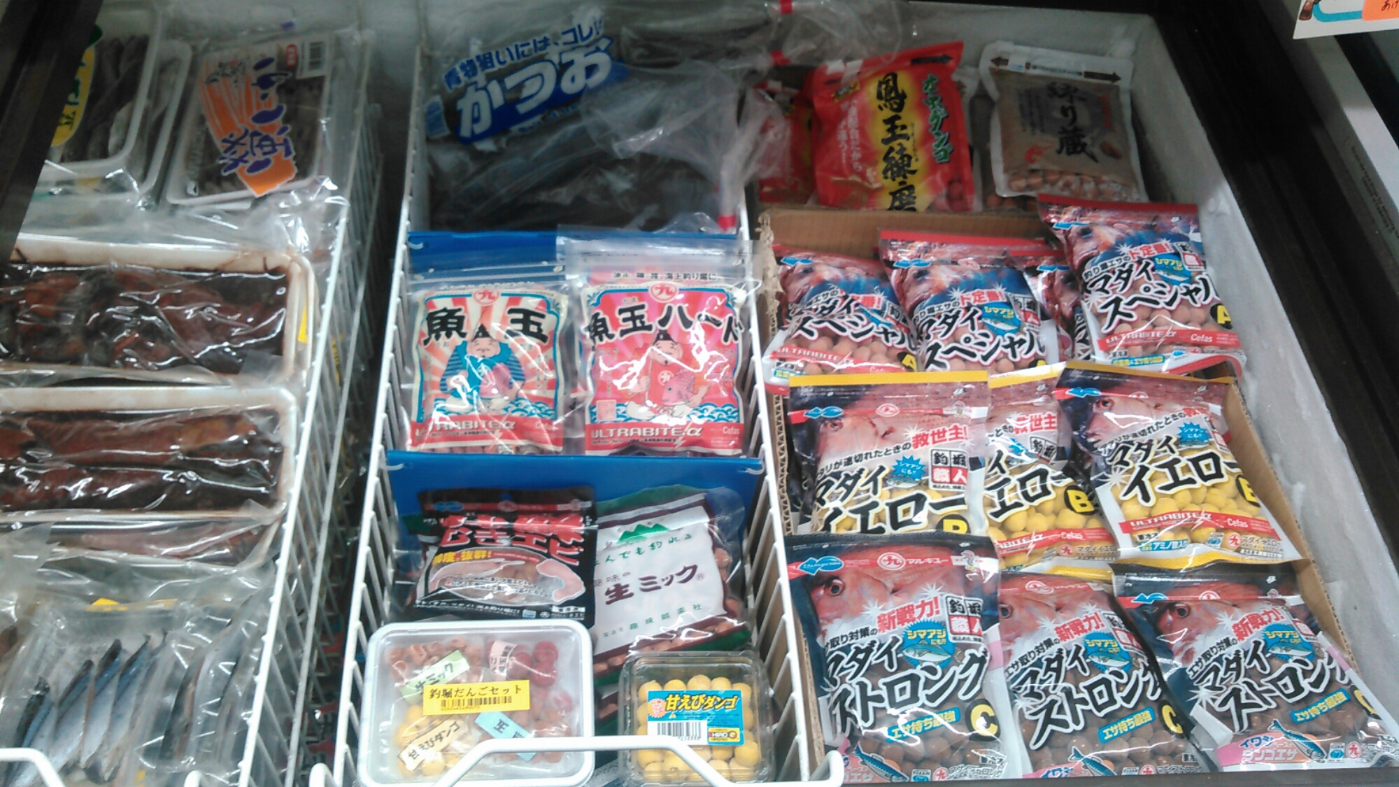 当店には多数の海上釣堀の仕掛けが置いてあり、私の担当でもある冷凍エサもたくさんご用意してますよ!!