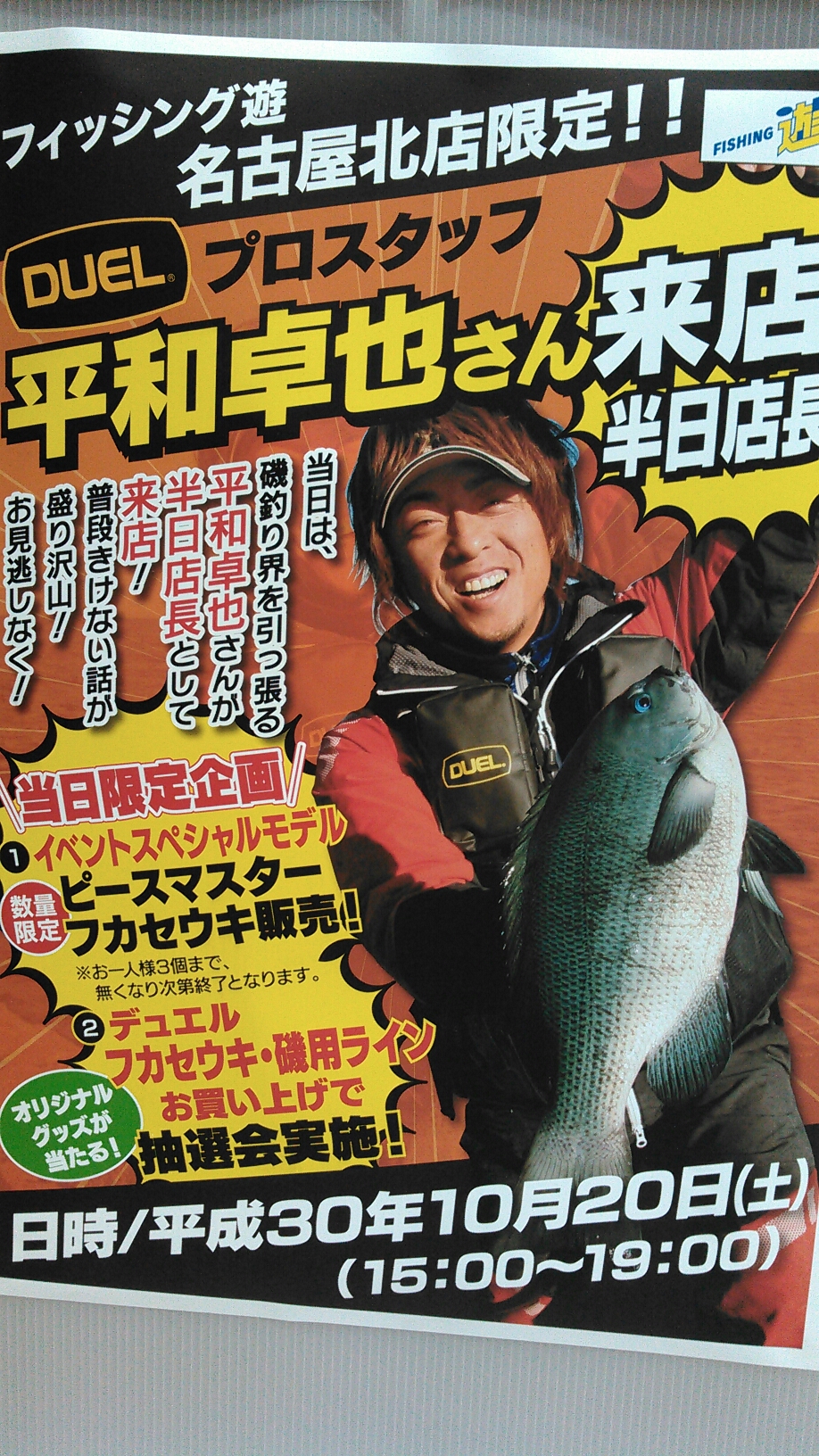 2018.10.19魚を釣る腕も凄い❗でも あの笑顔には誰も勝てない❗そんな平和卓也さんが来店されます。