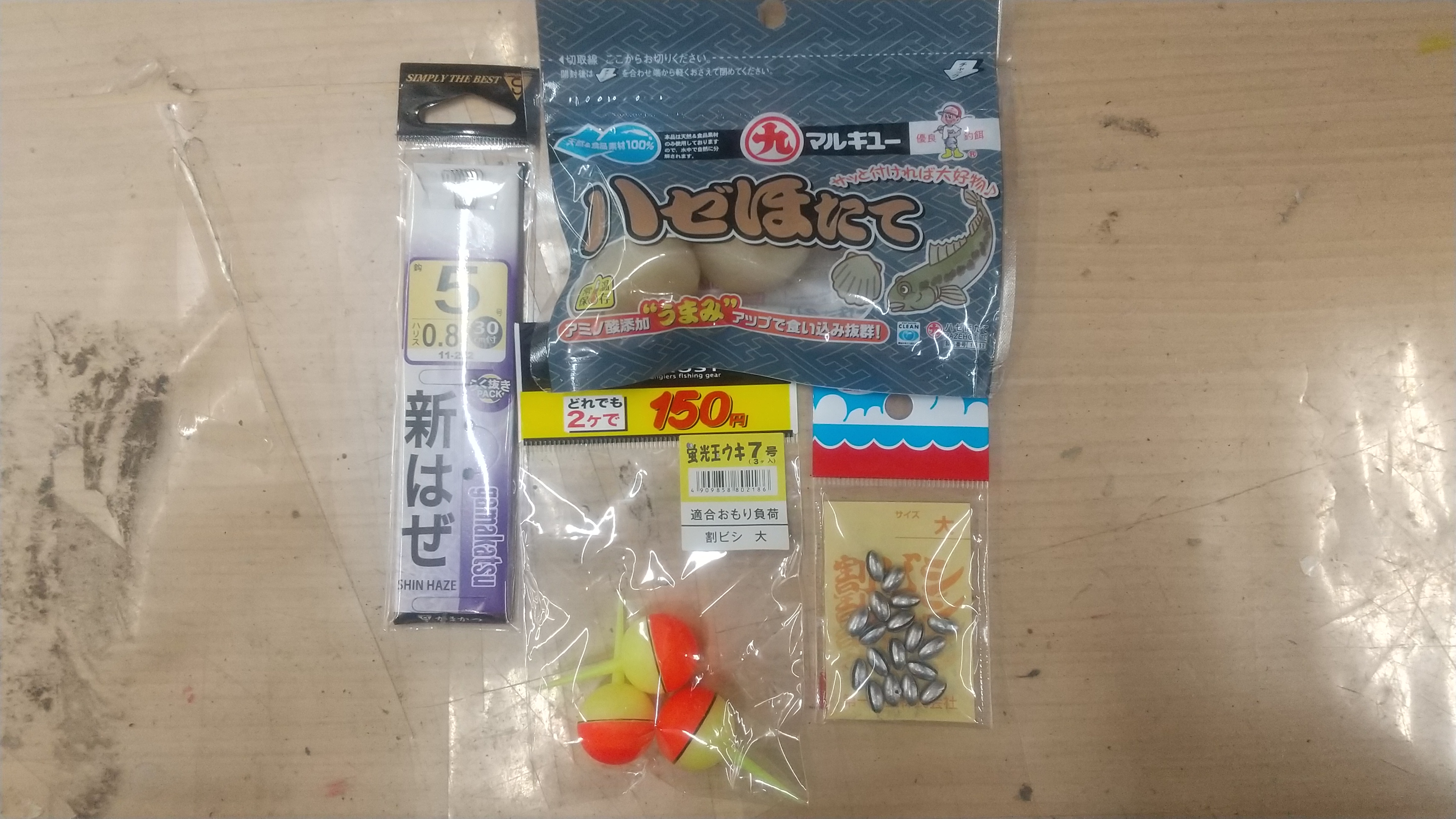 竿は3.6mの延べ竿、仕掛けは自作のウキ釣り仕掛け(ハリ5号、ハリス0.8、割ビシ大、玉ウキ8号)を使用しました。また、エサは、マルキューのハゼホタテを使用しました。