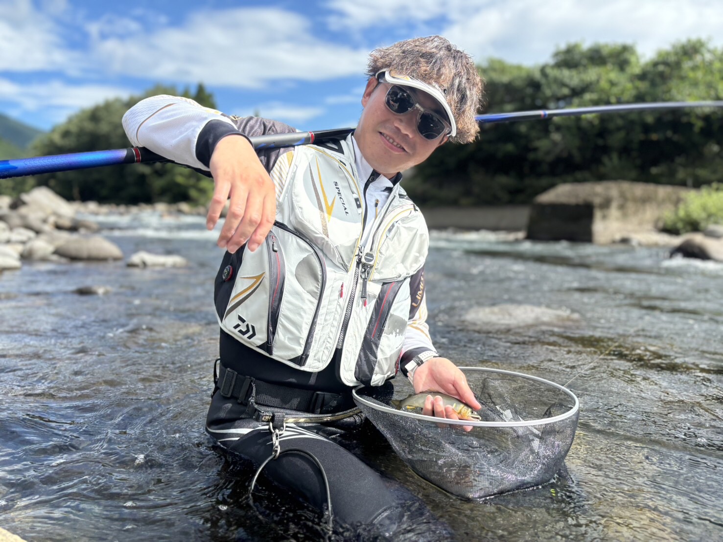 さっそく川へ入水して準備を始めますが、実はこの日がスタッフ小出の今シーズン初の鮎釣り(笑)