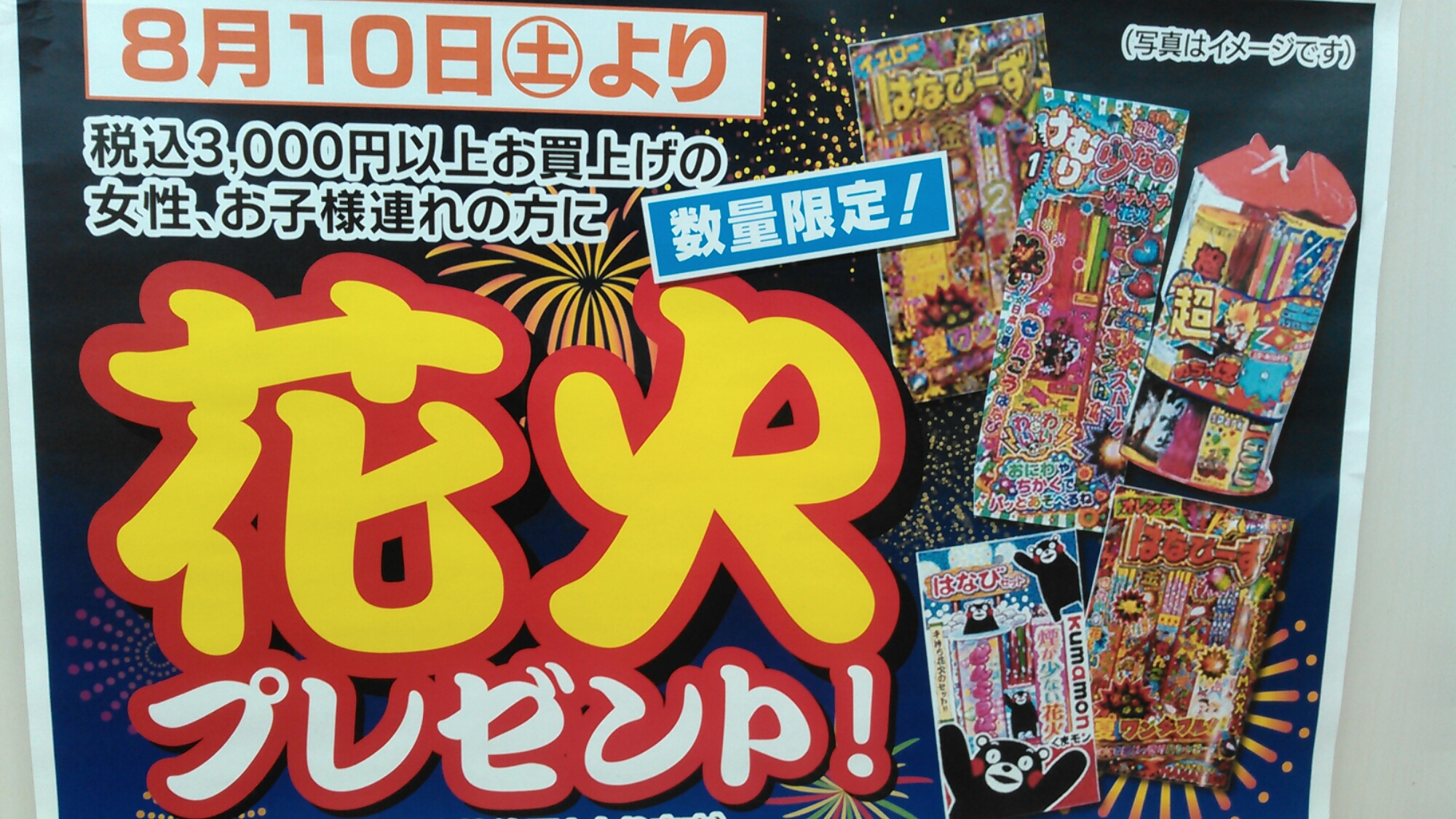 それにくわえお子様連れ、女性の方には三千円以上お買上げで花火の抽選をしてもらえます❗花火は空くじなしなのでご心配なく❗