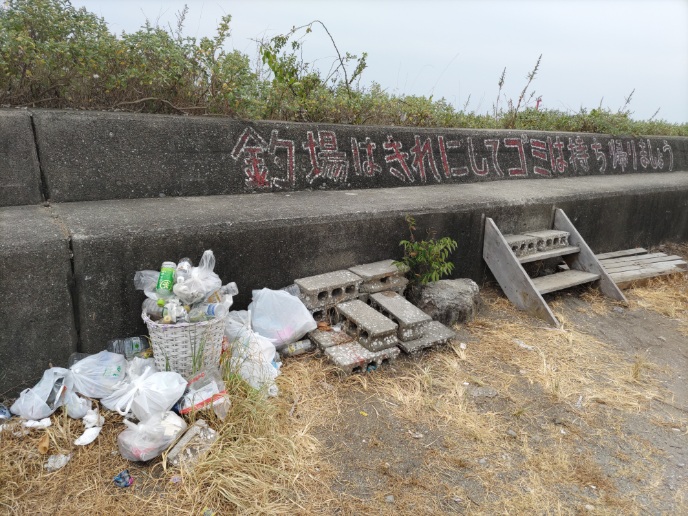 19日に有滝港の釣り場清掃に行ってきました。曇り空だったので倒れるような暑さは無かったですが。盆明けもあり2人では多いぐらいのゴミが集まりました。