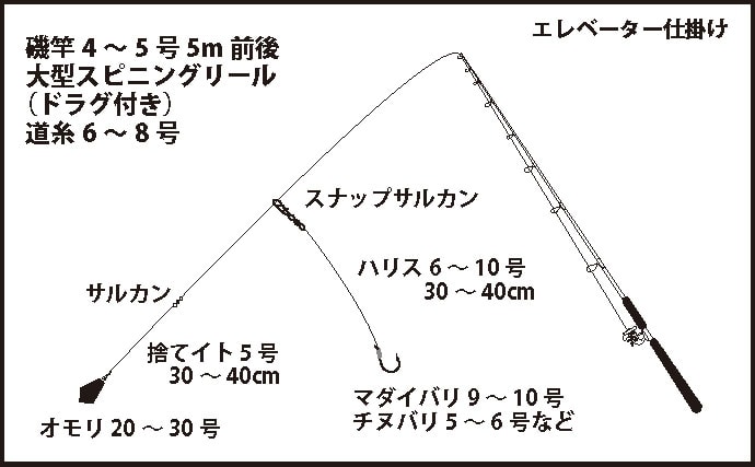 仕掛けにも色々種類がありシンプルなものはリールに巻いてある糸に針を結んだだけのフリー泳がせや先にオモリを投げ後からエサを投入するエレベーター仕掛け