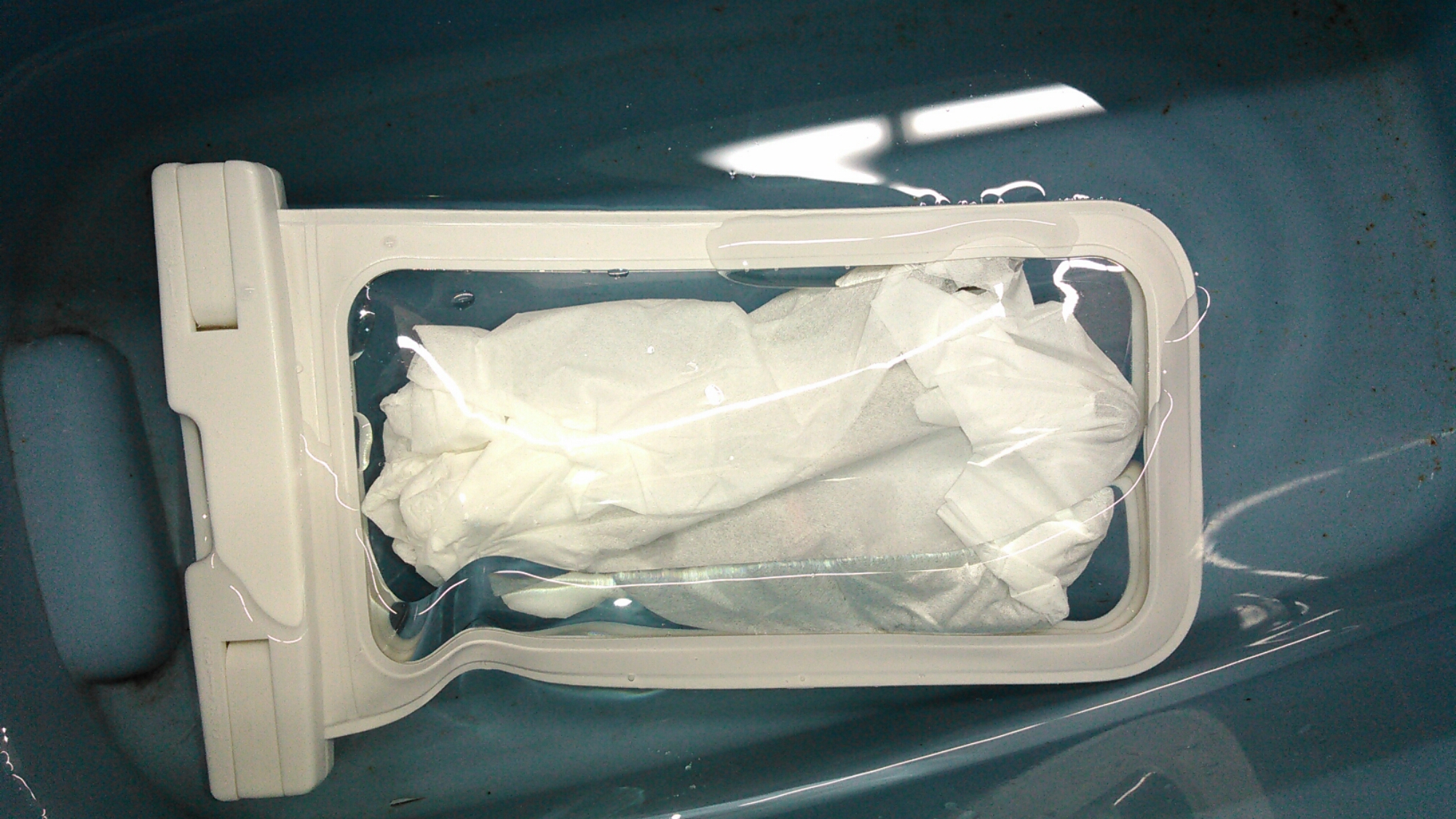 コチラの画像は携帯と同じ重さのオモリをティッシュに包んでケースに入れ水に入れてみました。