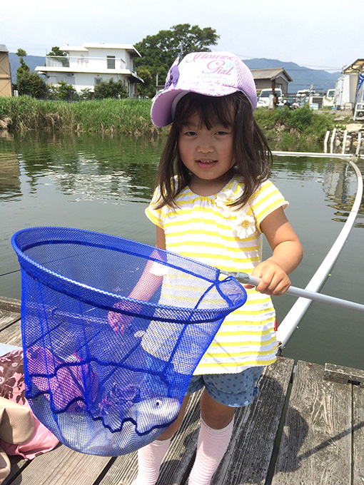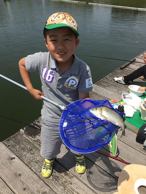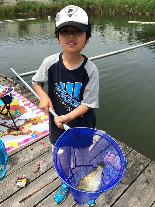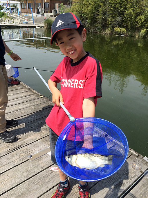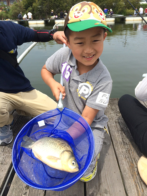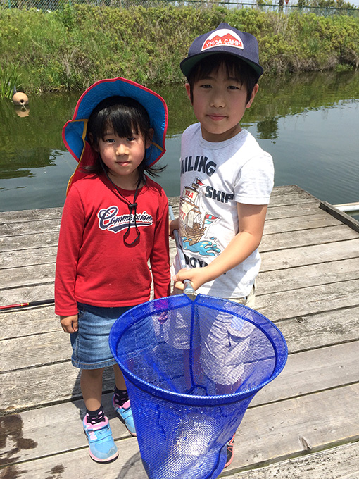 初めはぎこちなかった竿の扱いも、時間と共にスムーズになり、一人で釣れた魚をタモに入れることができるようになるお子様もいました。