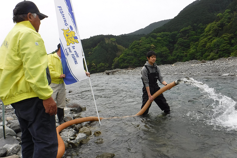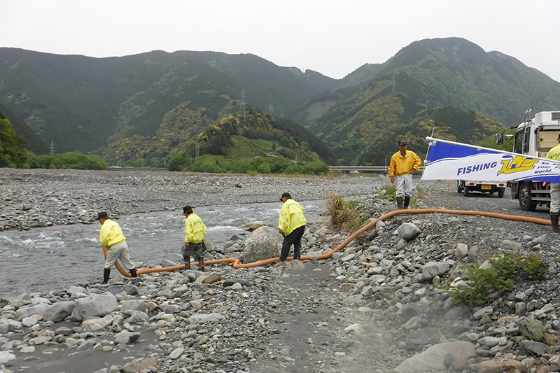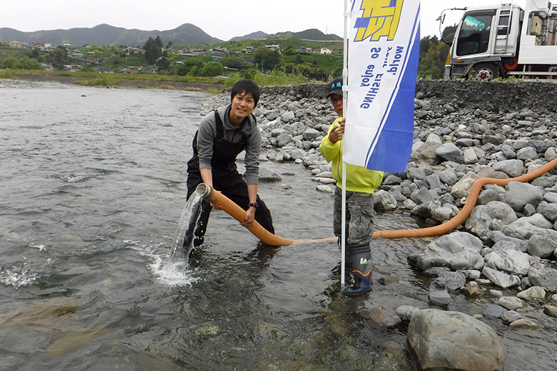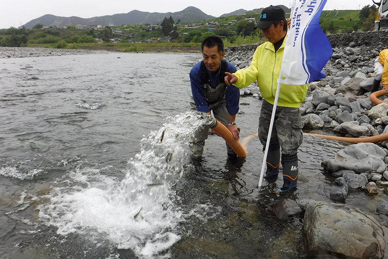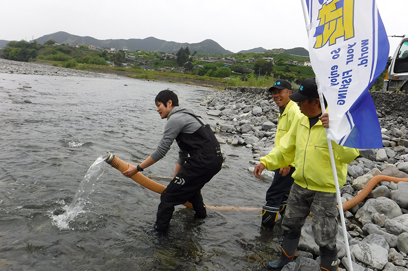 最初の放流場所となる安倍川松野(まつの)地区にて、100kgの放流にし、2か所目には郷島地区、3か所目の支流西河内川での放流も立ち会わせて頂きました。