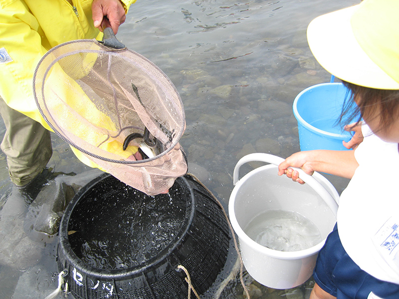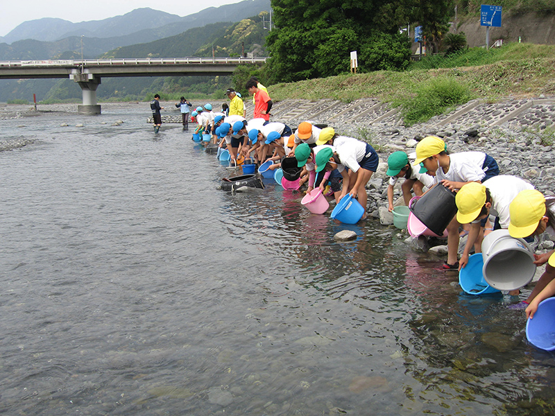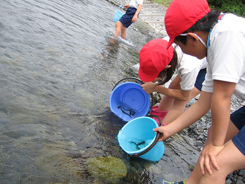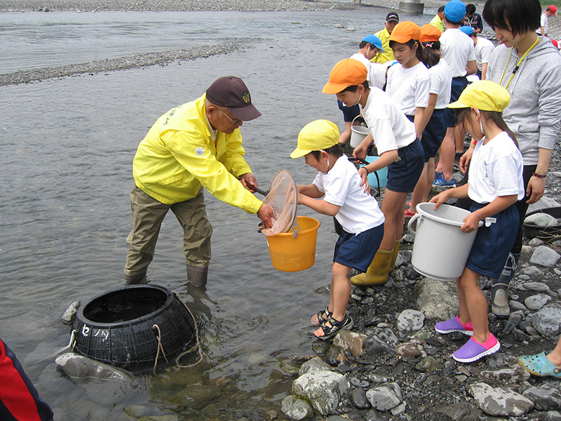地元の小学生の児童の皆さんも放流活動に参加され、元気いっぱいの鮎たちにビックリしながら優しく放流していただきました!