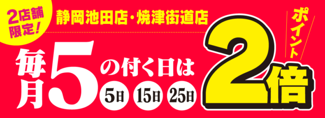 愛知県・静岡県内のフィッシング遊・FLD店舗対象!毎月2と5のつく日(2日・12日・22日・5日・15日・25日)は、ポイントが2倍になります!