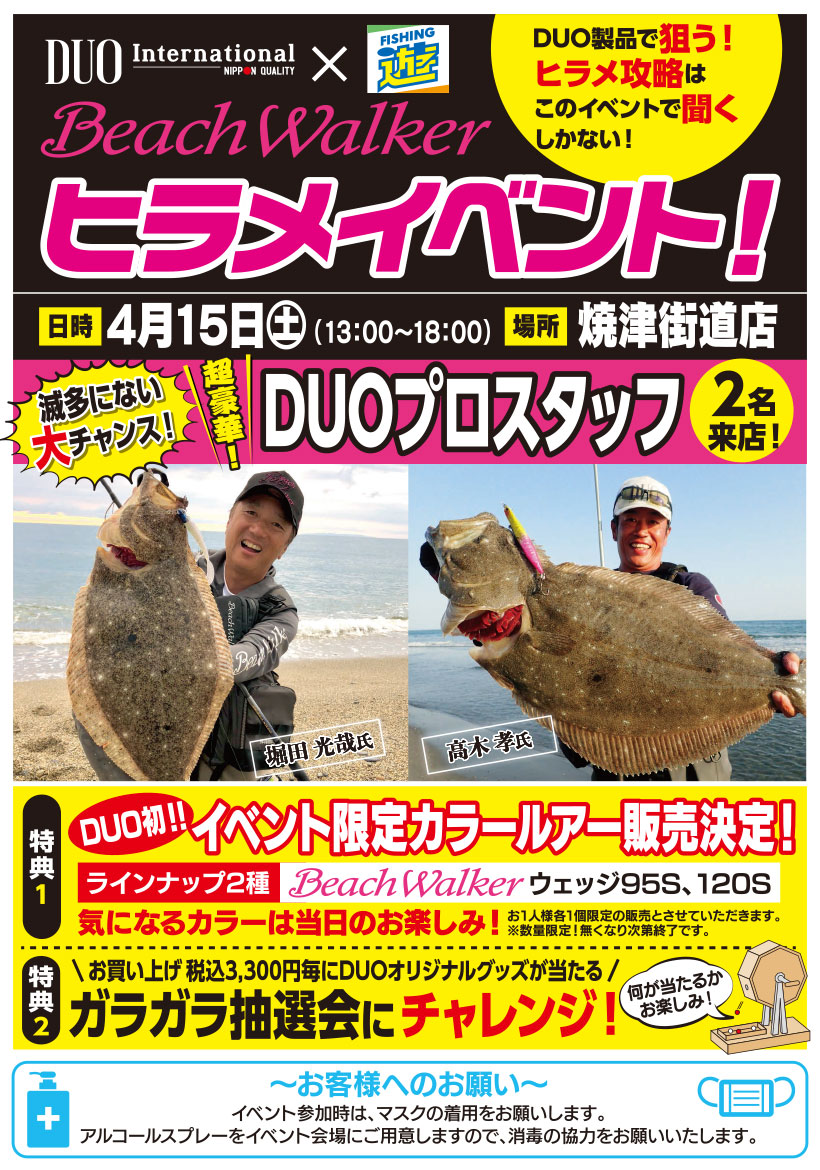 4/15(土曜日)焼津街道店店頭にてDUOヒラメイベントを開催いたします。