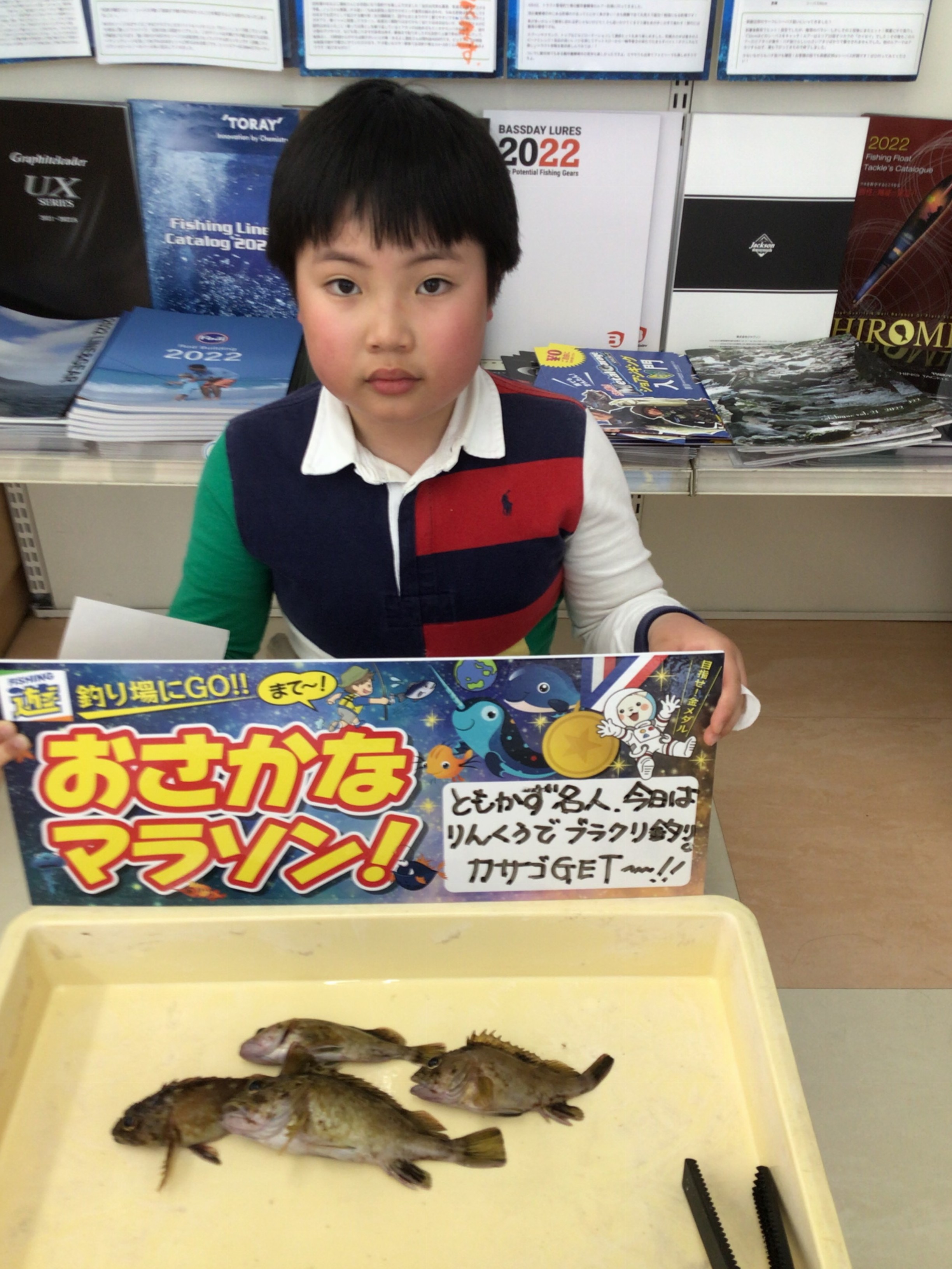 おさかなマラソン大常連のともかず名人、今日はりんくうでブラクリ釣り♪いつもより釣果は少な目ではあったようですが、しっかりカサゴを釣ってきてくれました(^^♪いつも思いますが、ボーズなしなのが本当にスゴイ☆彡次回は今シーズン最速の銀バッヂ!次もガンバレ~~~~!!!