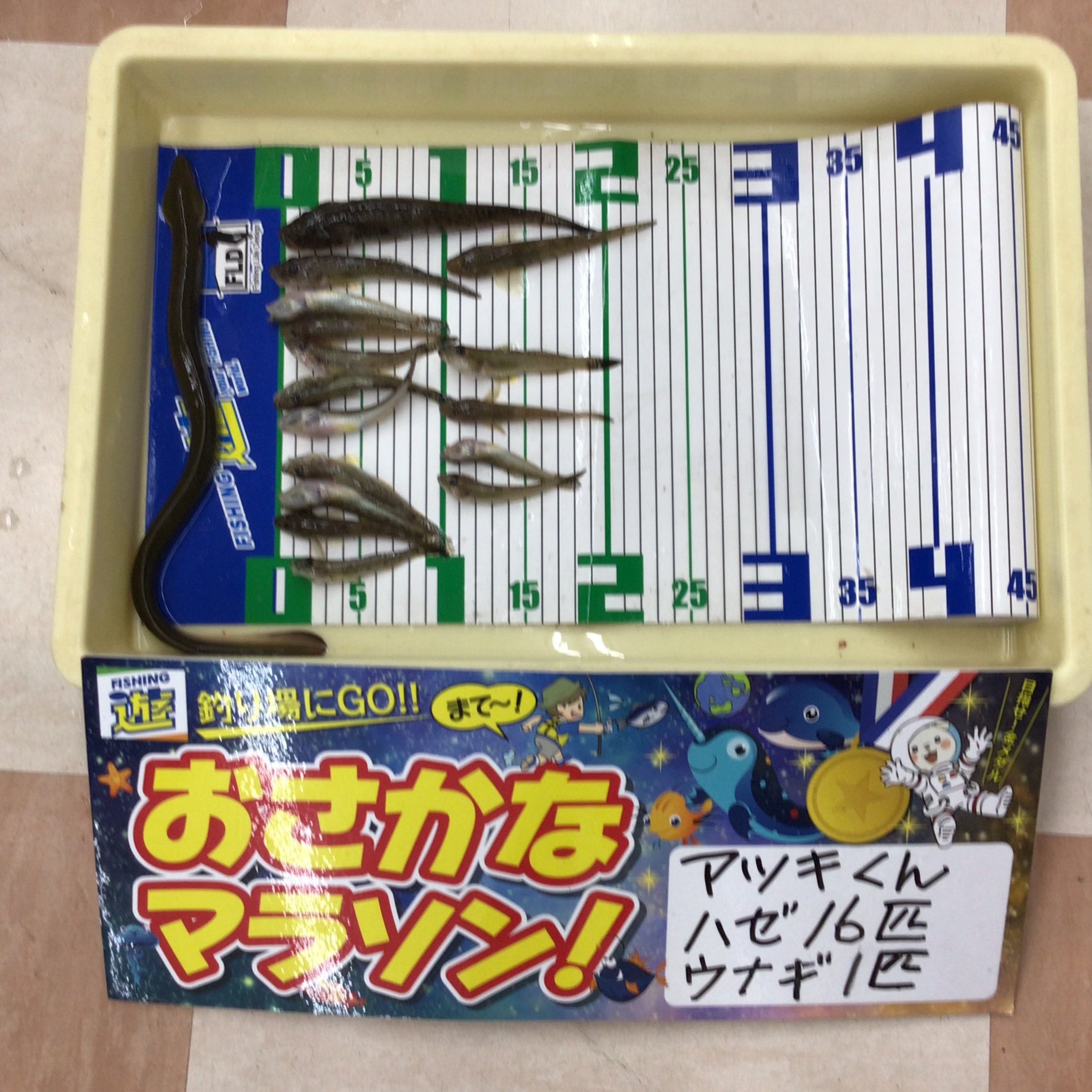 夕方青イソメとミミズを買いに来てくれたアツキ君が、ハゼ16匹とウナギ1匹を釣って持ってきてくれました❗️