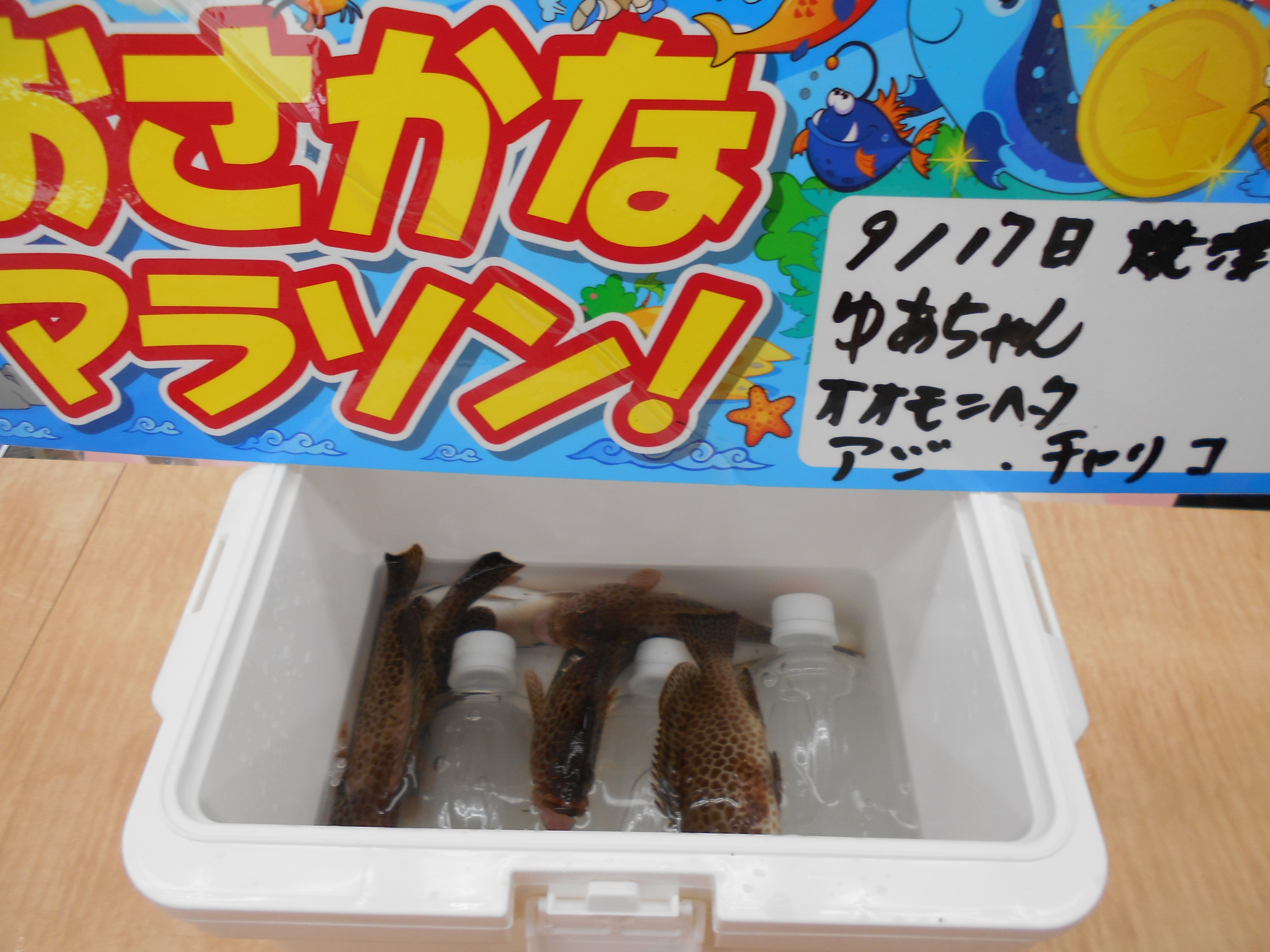こんにちは~焼津街道店です。本日はゆあちゃんが焼津港のサビキとちょい投げの釣果を見せに来てくれました。今日の釣果はオオモンハタとアジ、チャリコでした。おさかなマラソン完走まであとスタンプ3個。(^O^)/焼津港周辺ではタチウオが釣れています。アオリイカの釣果も上向きなので期待できそうですよ。