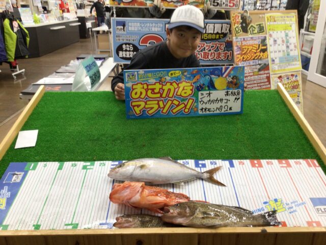 おさかなマラソンのお持ち込みを頂きました!シオ、ウッカリカサゴ、オオモンハタ2匹の豪華3魚種の釣果!!