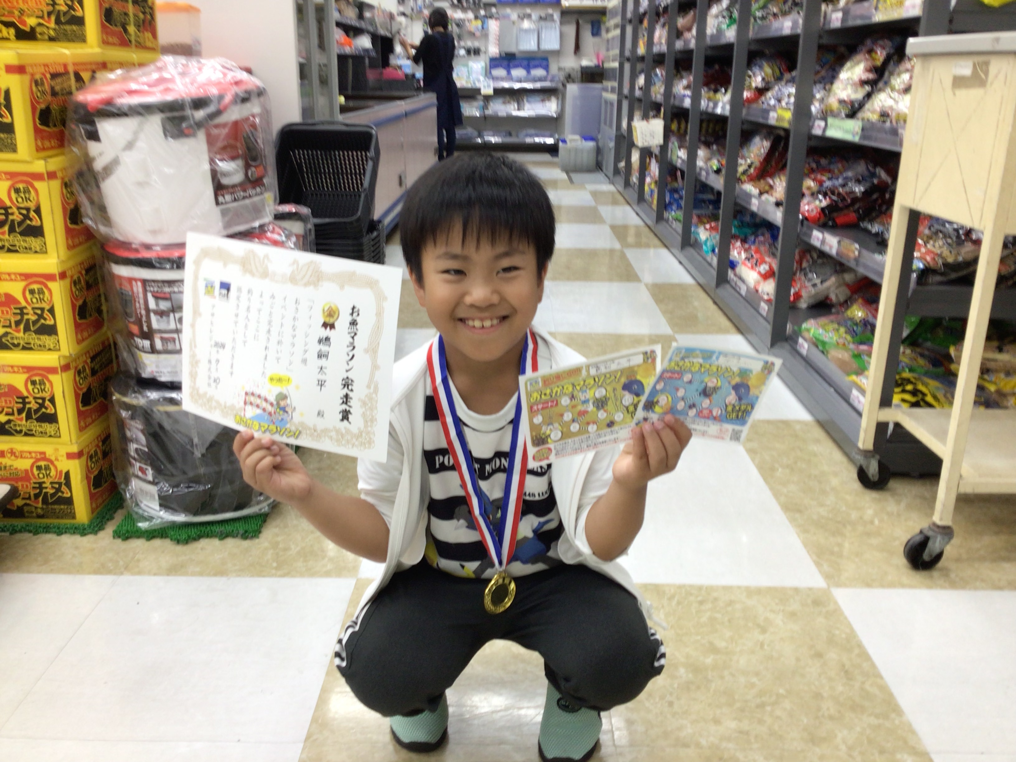 たいへいくんは、おさかなマラソン完走!!ゴールして、金メダルと賞状を受け取りました!!