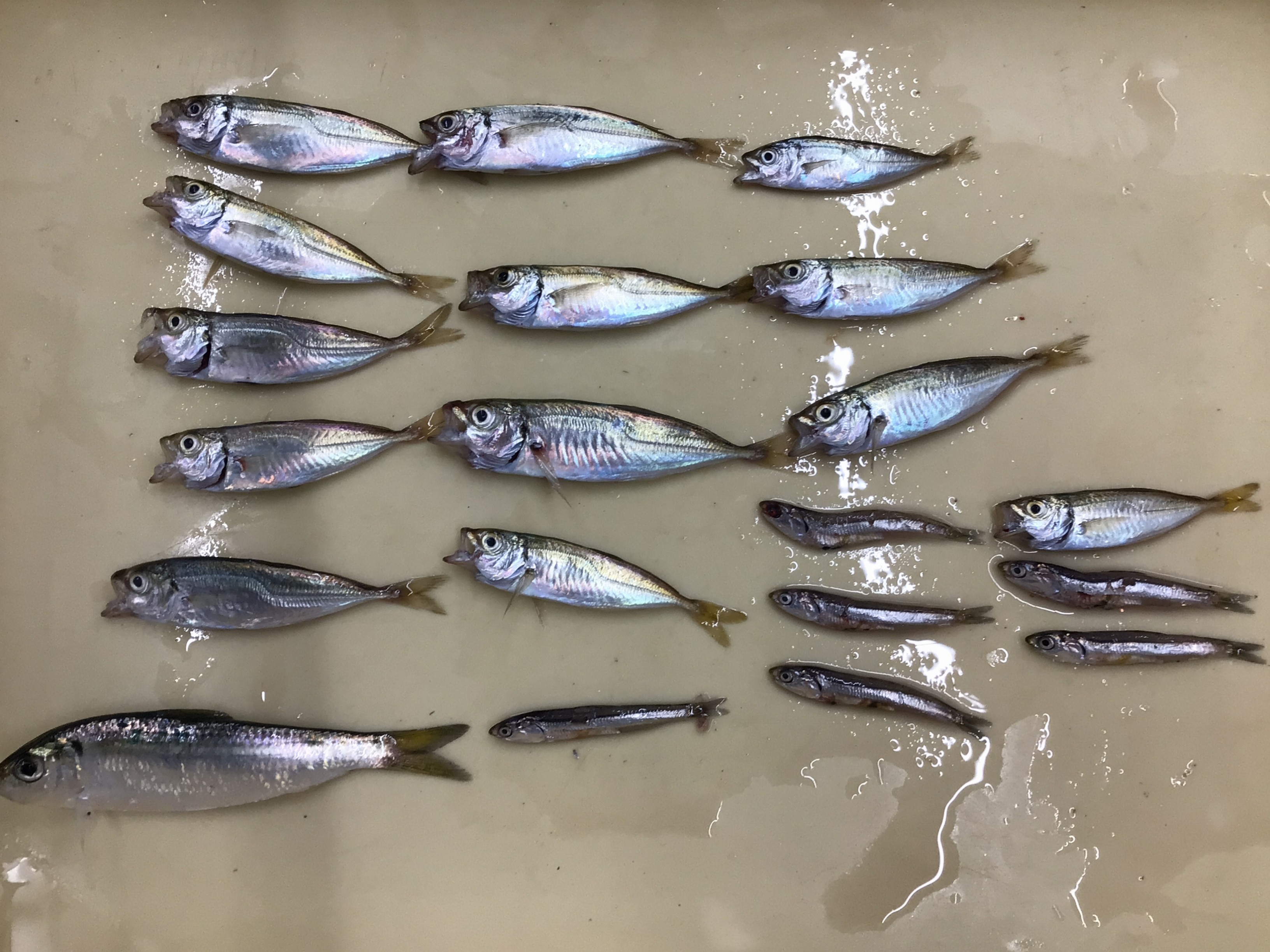 ご家族で朝8時から11時まで、常滑港でサビキにてアジ、イワシ、サッパを釣りあげました(^^♪