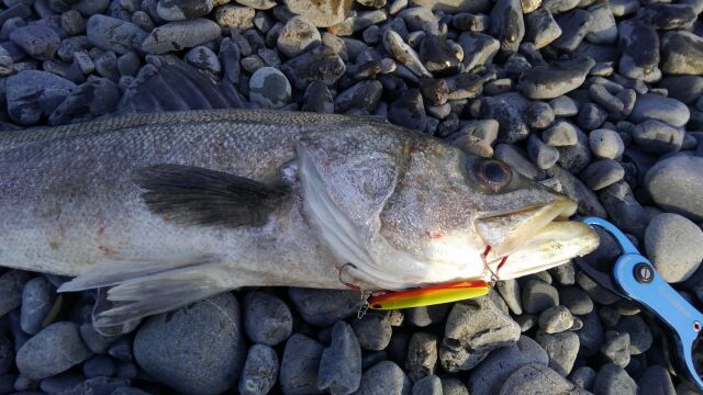 ドーーンっとティップが入りました!竿のパワーでやり取りして、50センチくらいかなと思ったらまさかの83㎝のランカーシーバスのお目見え!