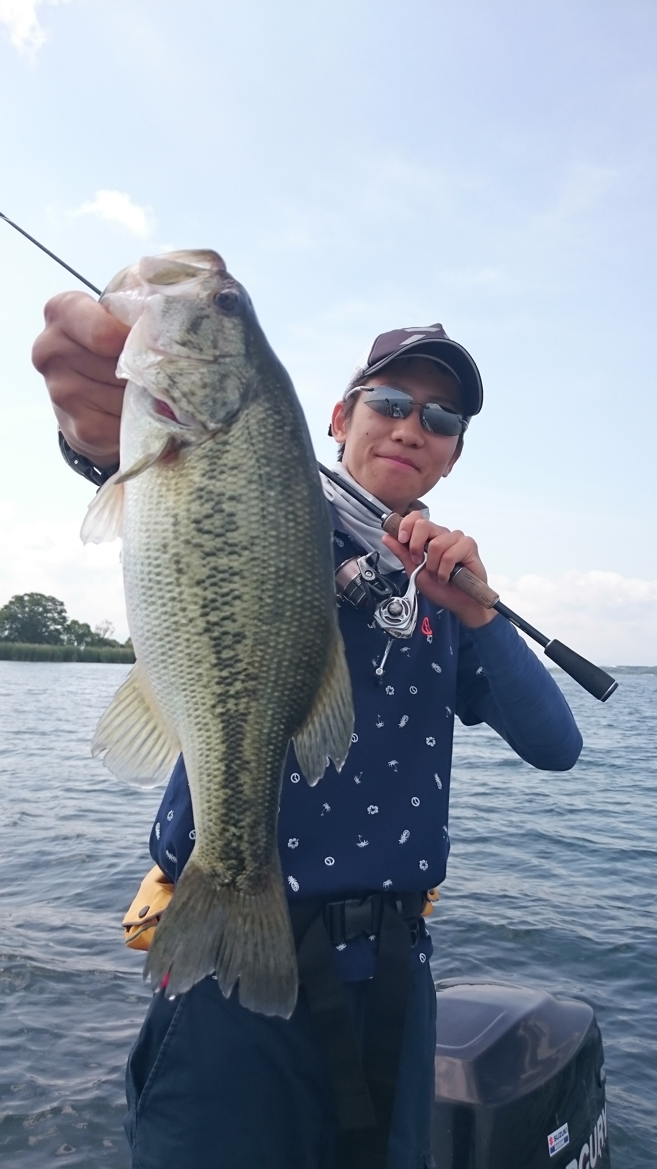 まずは小バスでもいいので1匹釣ろう!ということでウィードフラットエリアを流していきます。自分は魚探を見ながらエレキ操作に慣れるのに精一杯…。後ろの二人に頑張ってもらいます!もちろんネコリグです!すぐにバス釣り初の友人にヒット!30㎝の綺麗なバスでした!ベイトもいるしエリア的には問題なさそうだったので自分もスピナーベイトでサーチ開始!!しかしヒットしたのは嫁でした!自己記録の43㎝をゲット!その後も友人がサイズアップに成功し、浚渫エリアへ移動!ここではテキサスでボトムを舐めるように誘いますが反応なし。ベイトもいるし、地形的にはバスがいてもおかしくないはず…。と思っているとまたまた嫁にヒット!ロッドが満月になっています!デカいぞ!ウィードに巻かれていたのでボートを真上まで着け、無事にランディング成功!またまた自己記録更新の50㎝!そこから急に風が強くなり始め白波が立ち始めたので帰着となりました。自分はボウズで終わってしまいましたが、ボート操作やエリア選択などとても勉強になった半日でした!次は自分も釣ります!