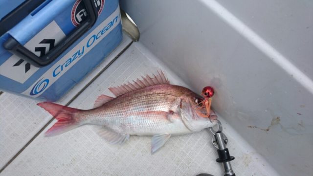 釣っていると、がまかつのタイラバ桜幻でヒットしてマダイをキャッチ出来ました。その後、潮が緩んだのか、糸がまったくフケず、タイラバでも100gのジグでも全くあたらないので、潮も緩いことですし、リジェット40gを投入するとアタリの遠のいた時間帯で連発でエソが釣れました、これは結構魚の反応いいなと思い、リジェットを使っているとガッツんと何かヒット、ドラグを出されて寄せてを繰り返して上がってきたのは86cmのマダイでした。その後は少し仮眠をとってから再び再開すると潮が効き始め40gのジグは厳しくなったので100gの桜幻に換えると再びヒットしてマダイキャッチしました。そしてその後、終了間際に同サイズをもう一枚追加して終了しました、今日は色々使いましたが、がまかつのタイラバ、桜幻がかなり良かったです。