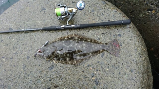 朝、たけ坊さんがヒラメを結構釣ったと聞いて夕方、久し振りにそのポイントに行ってみました。夕方から波が上がる予報でしたが波は上がらずでしたが、雨はぱらついていました。 リザスターで50cm位のを1枚、45cm位のを1枚30cm位のを2枚の4枚釣りました。 今日はデスアダーなどはあたらず、リザスターが強かったです。