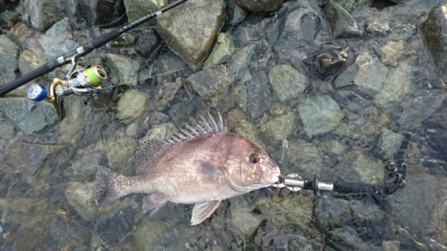 その後、アクアリザスターをスーパーメッキカラーに変えると1発で何かヒット、なかなか良く引き、引きでは魚種が判断できない感じで上げてみると50cm位のコショウダイでした。普段あまり釣らない魚が釣れるとちょっとうれしいです。