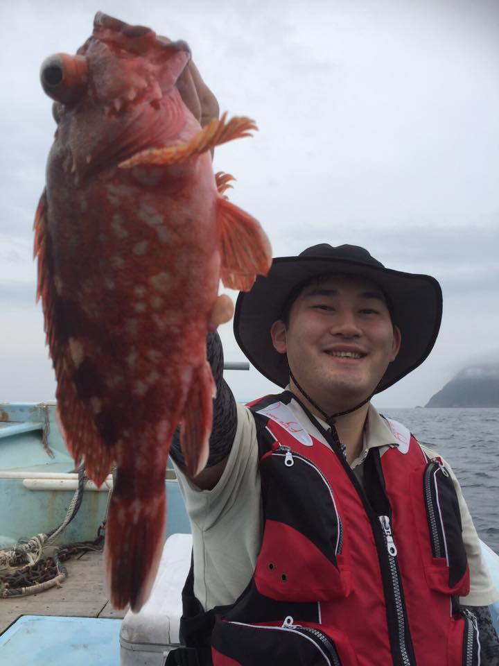 その後潮が動き始めて、ポイントを潮が緩めの漁礁の頂上まで移動すると今度は塩焼きにぴったりサイズの真鯛がHIT!カンコの中が水族館みたいになってきました。強烈な2枚潮に悩まされながら丹念に海底の瀬を攻めていると同行した黄金店スタッフの内藤さんに待望のカサゴHIT。すると私と日進店山内さんにも同時にカサゴが!その後はコンスタントに釣れ続けカサゴ祭が繰り広げられました!潮が複雑なため水深+10m以上糸が出てしまうので、全員根掛かりとの戦いでしたが仕立て船特有ののんびりとした雰囲気の中、旬の夏カサゴ釣りを堪能する事が出来ました。途中船長にはジャンボイサキも飛び出しました!