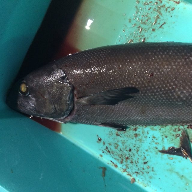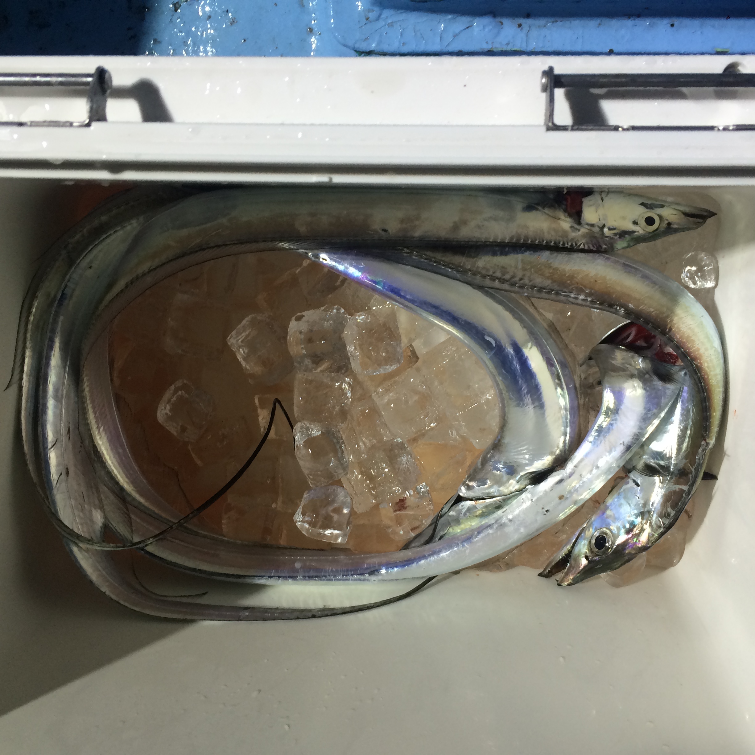 是非バラムツを釣ってみたい!!!という東京からのゲストをお招きして久々のバラムツ、狙いに行って来ました。東京組、オフショアの経験が少ないという事で、他にも釣れるものはみんな狙いたいとのリクエスト。まずはタチウオを狙うことに。しかし前日までの荒天で濁りが入り、潮もあまり動かず激渋・・・。アタリもほとんどなく1時間半程で船中4匹。無残な結果に・・・。気を改め本命バラムツ釣りへ!とにかく東京組に釣って帰ってもらいたいのでエサ釣り、ジギング、エビング等様々なスタイルで魚信を待ちますが沈黙が続きます・・・。サバ釣ってみますがダメ。運よくイカも1杯確保できたので泳がせますが取られて終わり・・・。小雨も降っておりみんな無口です。遂に東京組の一人にアタリが・・・!十分に食いこませて大きくアワセ入れての~、ヒット!!!初体験の暴力的な引きにかなり焦っている様子。みんなの見守る中見事キャッチ!10キロまではいかないサイズ、ちょっと小ぶりでしたが感動の初キャッチ!おめでとうございます。あとは船中1回サットウが掛かりましたが惜しくもフックアウト。辺りはあるも乗らずに終了となりました。東京組の2人リベンジに燃えておりました。今度は絶対に釣らせるからね~!