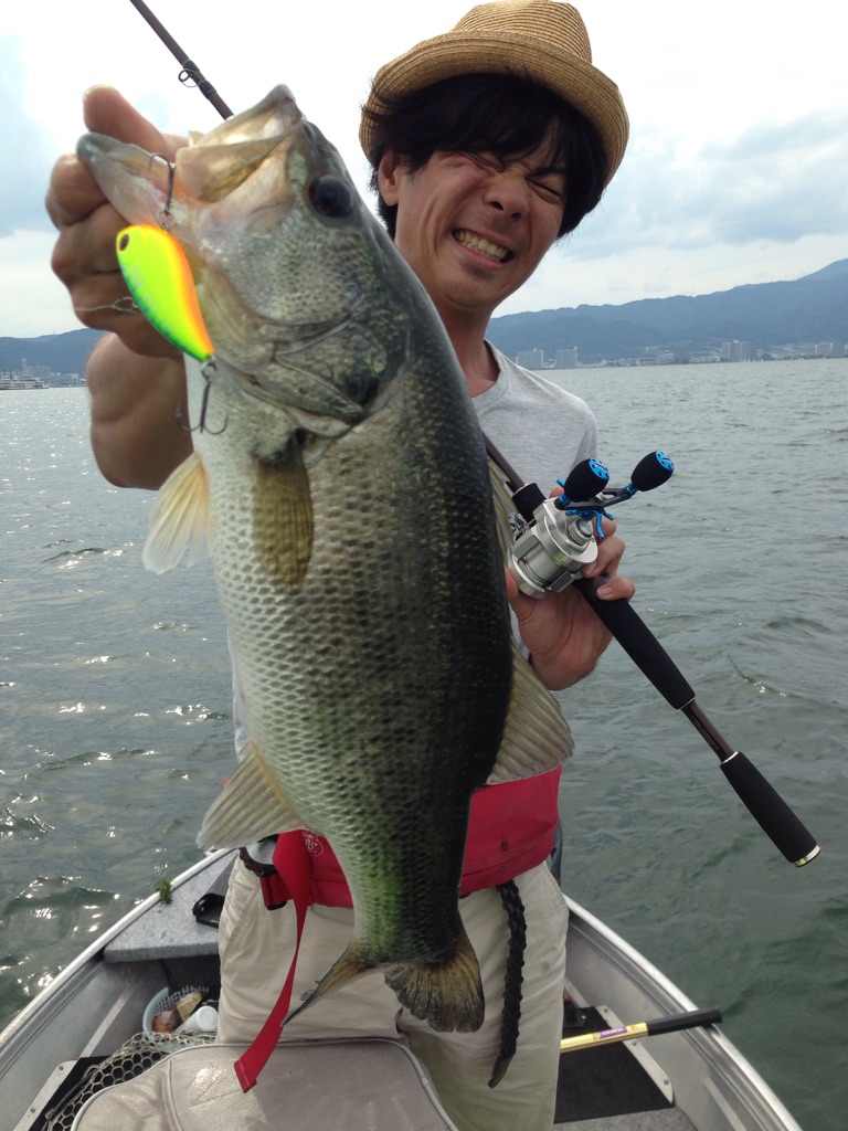 久しぶりの琵琶湖でボート釣行です。今回はダイワのルアーオンリーで挑戦!朝一、西岸のシャローでコバスの数釣りをダイワのガストネードで楽しみ、サイズが上がらないので、東岸の沖エリアへ移動します。スティーズポッパー、ガストネード、ハイドロハンド、スキニーカーリーでこれまた小バス祭り。北風に流され、浚渫エリアに到着しました。ここで、エッジ付近をクロウズのテキッサスでじっくり釣ると、単発で41㎝!このエリアも昼で見切り、南下します。水深3mほどのウィードフラットエリアに着き、TDバイブスティーズカスタムで早巻きすると、これがハマり、42㎝、45㎝、49㎝、43㎝、42㎝と短時間で連続ヒット!すさまじいバイトの連続で、少々焦りました(笑)終わってみれば2人で30匹以上の釣果でした。夏のバイブ熱すぎます。