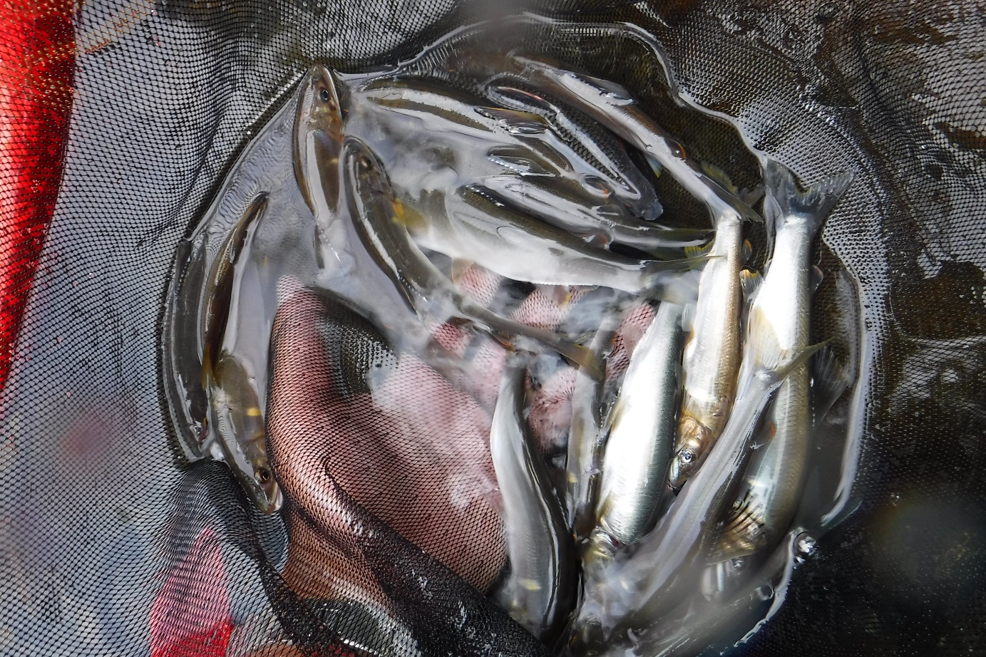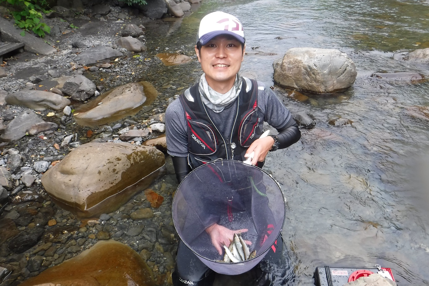 今シーズン一生懸命アユを追い続けている同店宮越さんと今回入川したのは富沢地区。前回宮越さんは同ポイントへ入川し、鮎は見えるもののなかなか攻略できず、リベンジを誓って、あえて同じポイントを選びました。しかし、開始2時間経過し早い昼食にしようか?というタイミングで私が3尾。宮越さんも同数で場所移動を決めました。次に向かったのは解禁直後に入川した小島地区です。小島橋上流のチャラ瀬の石の色が良く、私は17時までにここで11尾を追加しました。宮越さんは・・・次こそは「ツ」抜けして下さいヨ^o^