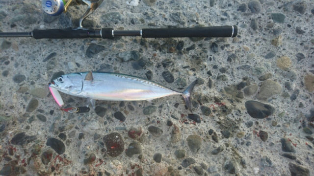 本日は朝からショアジギングに行ってきました。日が昇って少したった頃から魚のアタリが出始めました。8月末頃クレイジーオーシャンから発売予定のメタルジグ リジェット40gをキャスト、糸を送りながらなるべくフリーフォールで底まで落とし、底に着いたら直ぐに少し早めのタダ巻きで巻いてくるとガツンとヒットしてきます、フォール中のヒットもありました。1時間ほどの間コンスタントに当りがありソーダカツオを5匹、サバを1匹キャッチ出来ました。リジェットはタダ巻きでも凄く釣れるのでオススメです!